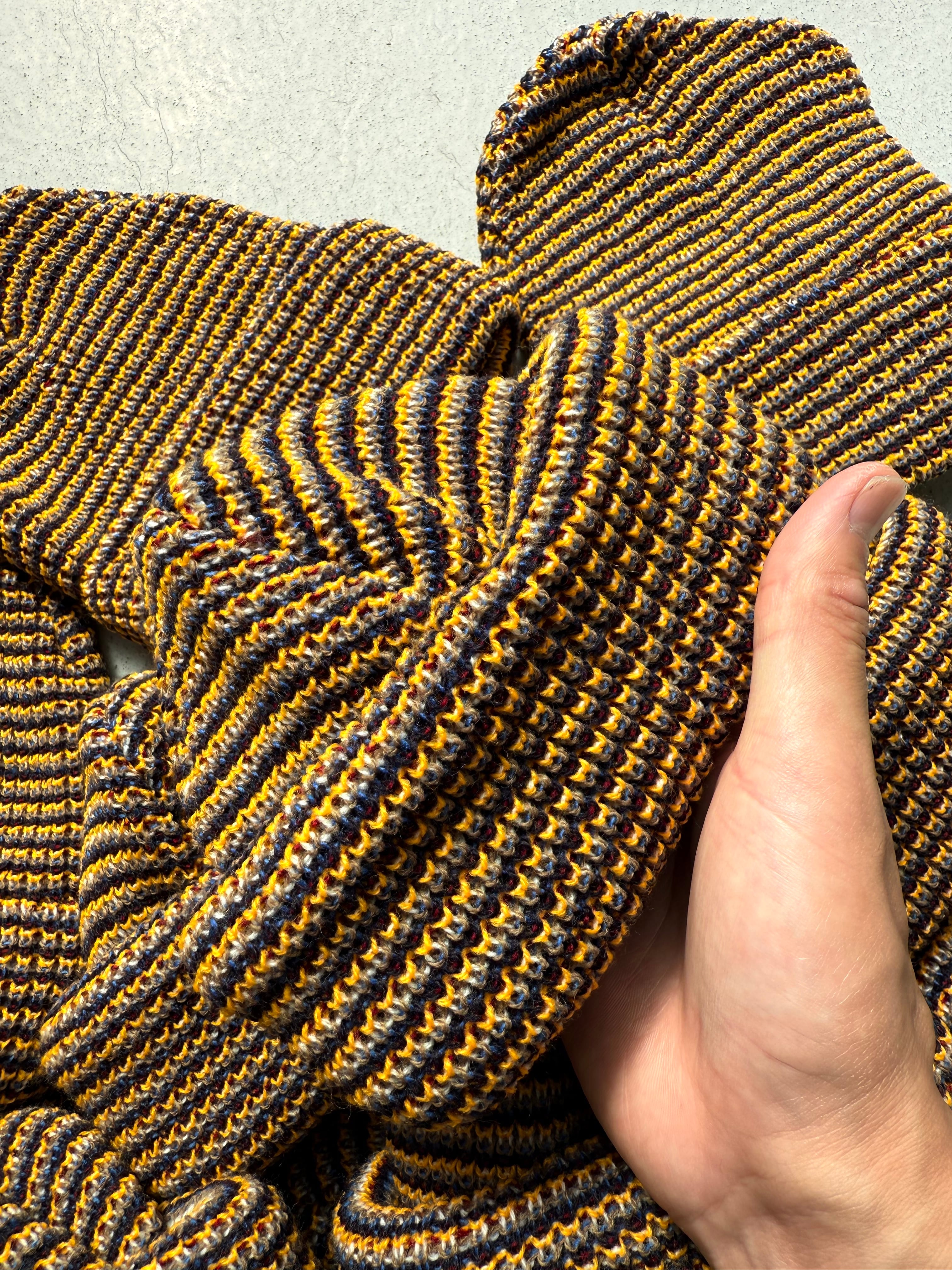 マルチカラーの編上げスタイルのビーニーです。使われている糸の色が多色で複雑で絶妙な雰囲気を醸し出しています。伸縮によって色味が変化するのも面白いです。
