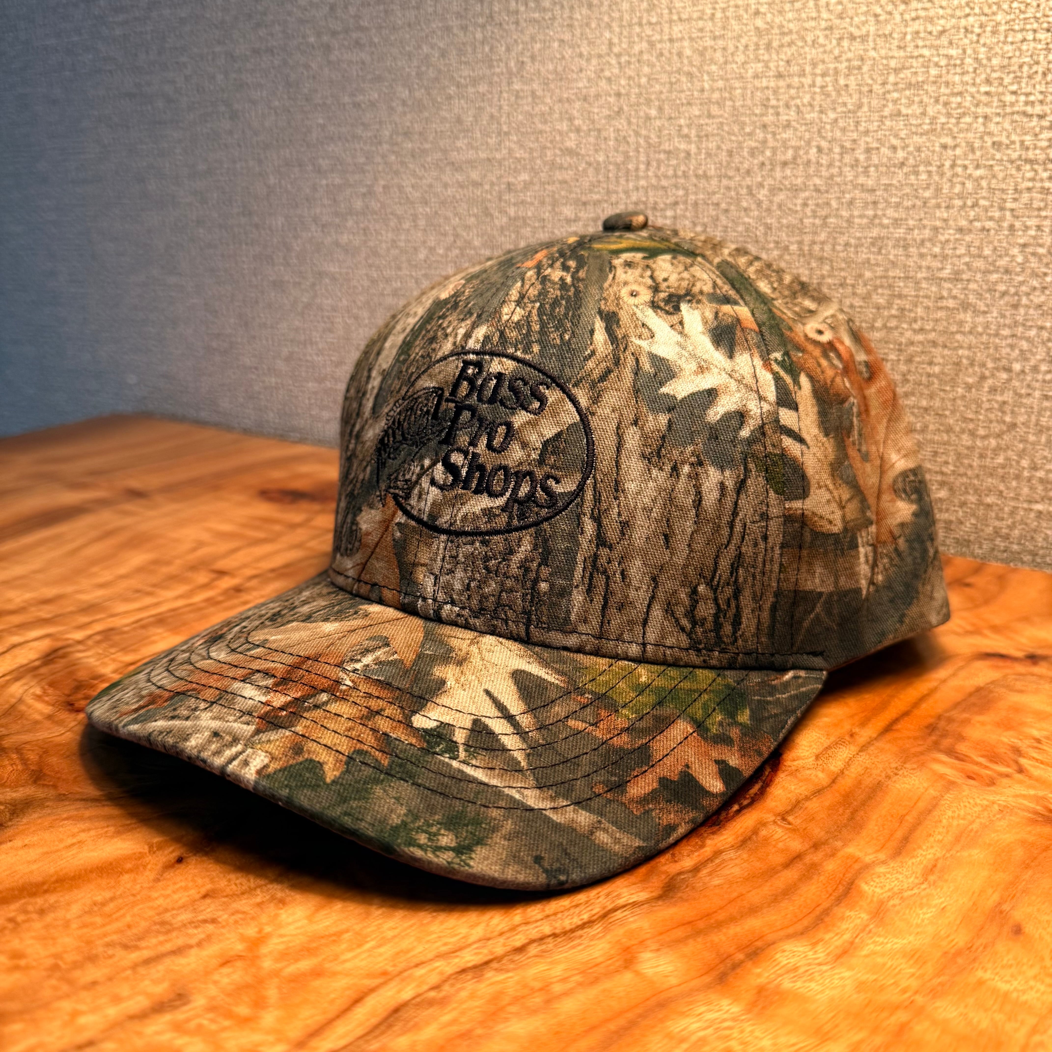 アメリカ買付のバスプロショップスのリアルツリーキャップです。メープルリーフなどがリアルツリーでプリントされています。フロントにBass Pro Shopsのロゴが入りますが、いい意味でカモフラされています。