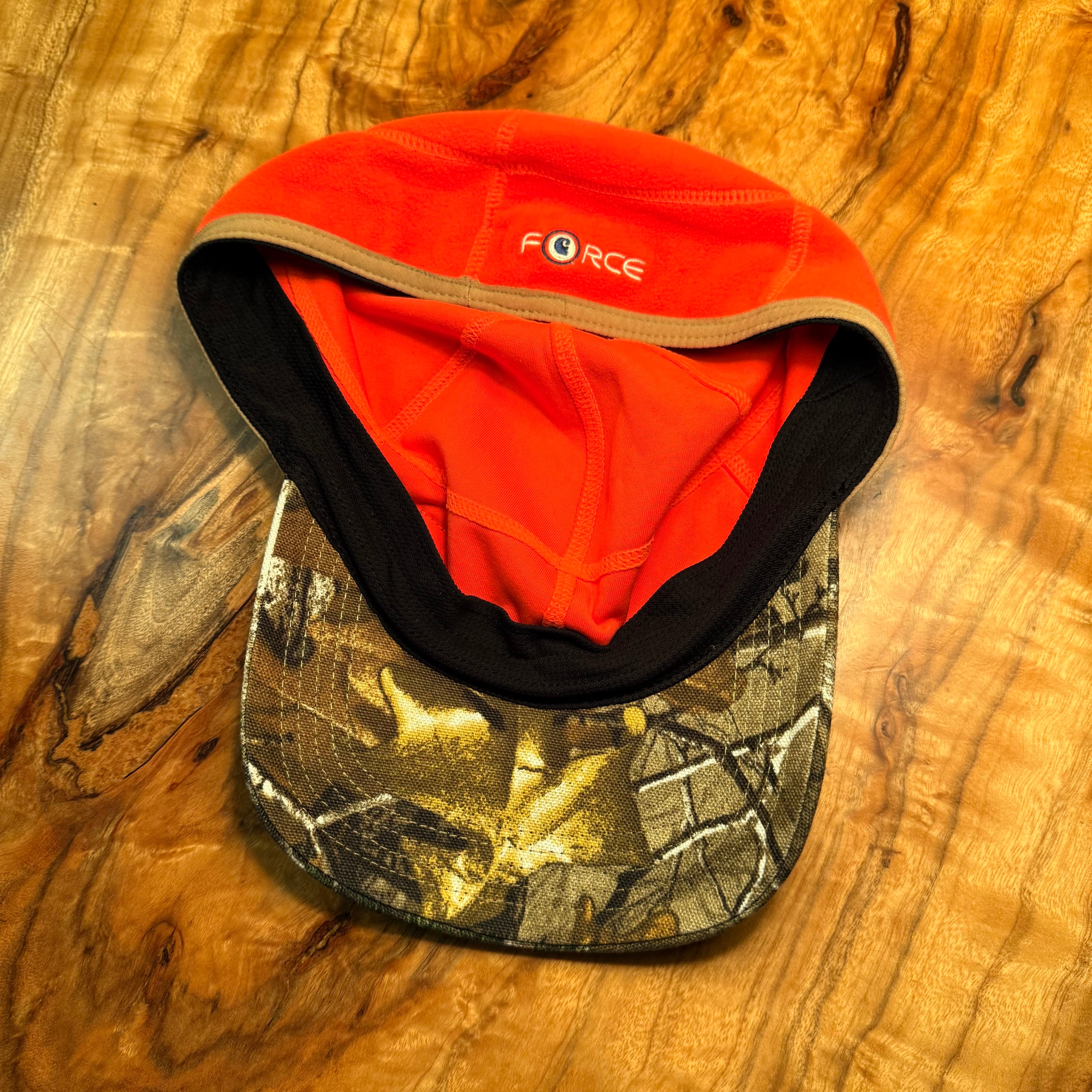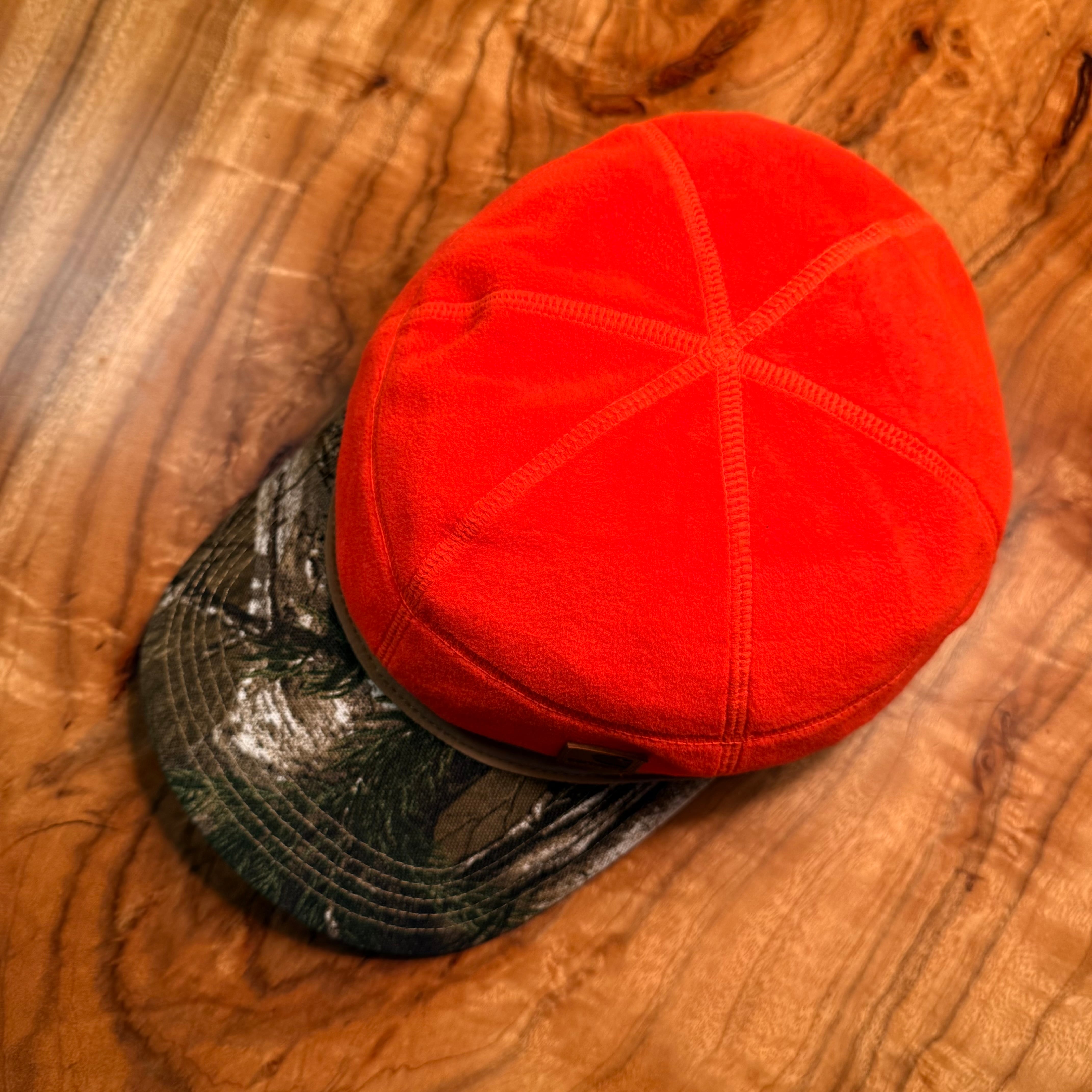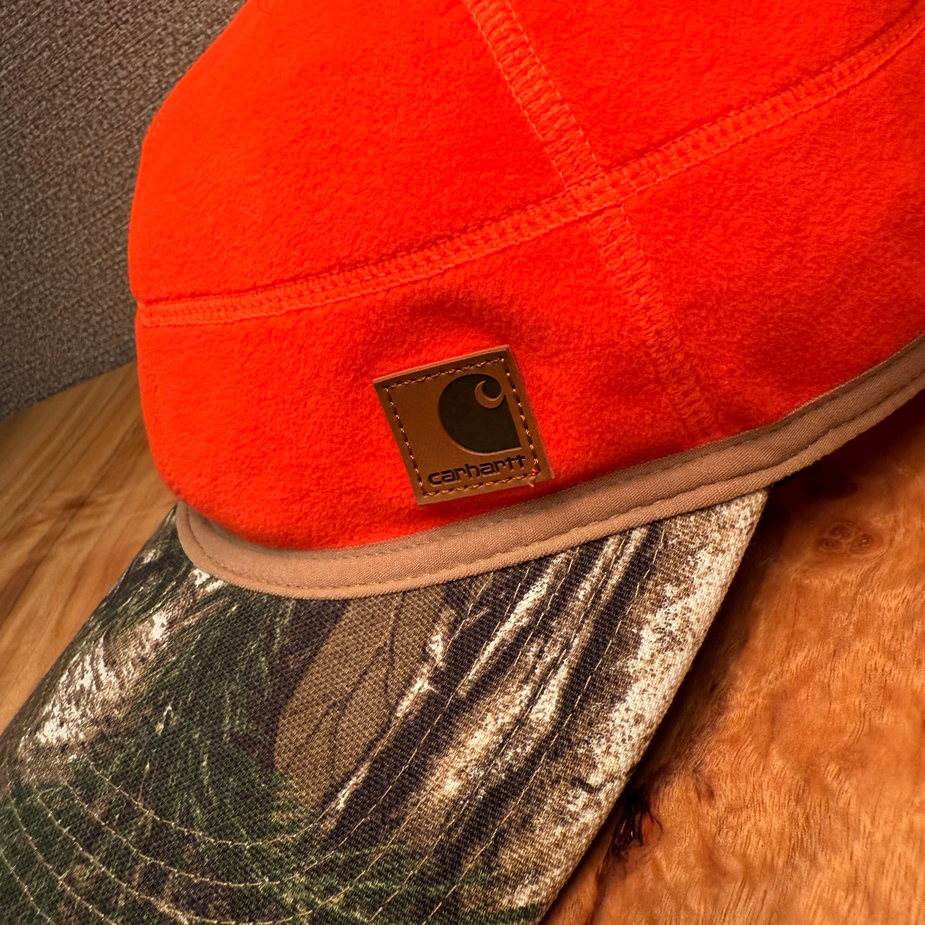 カーハートのForce Griggs Fleece Visor Capです。クラウンがオレンジのフリース生地、ブリムはリアルツリー柄のコットン。