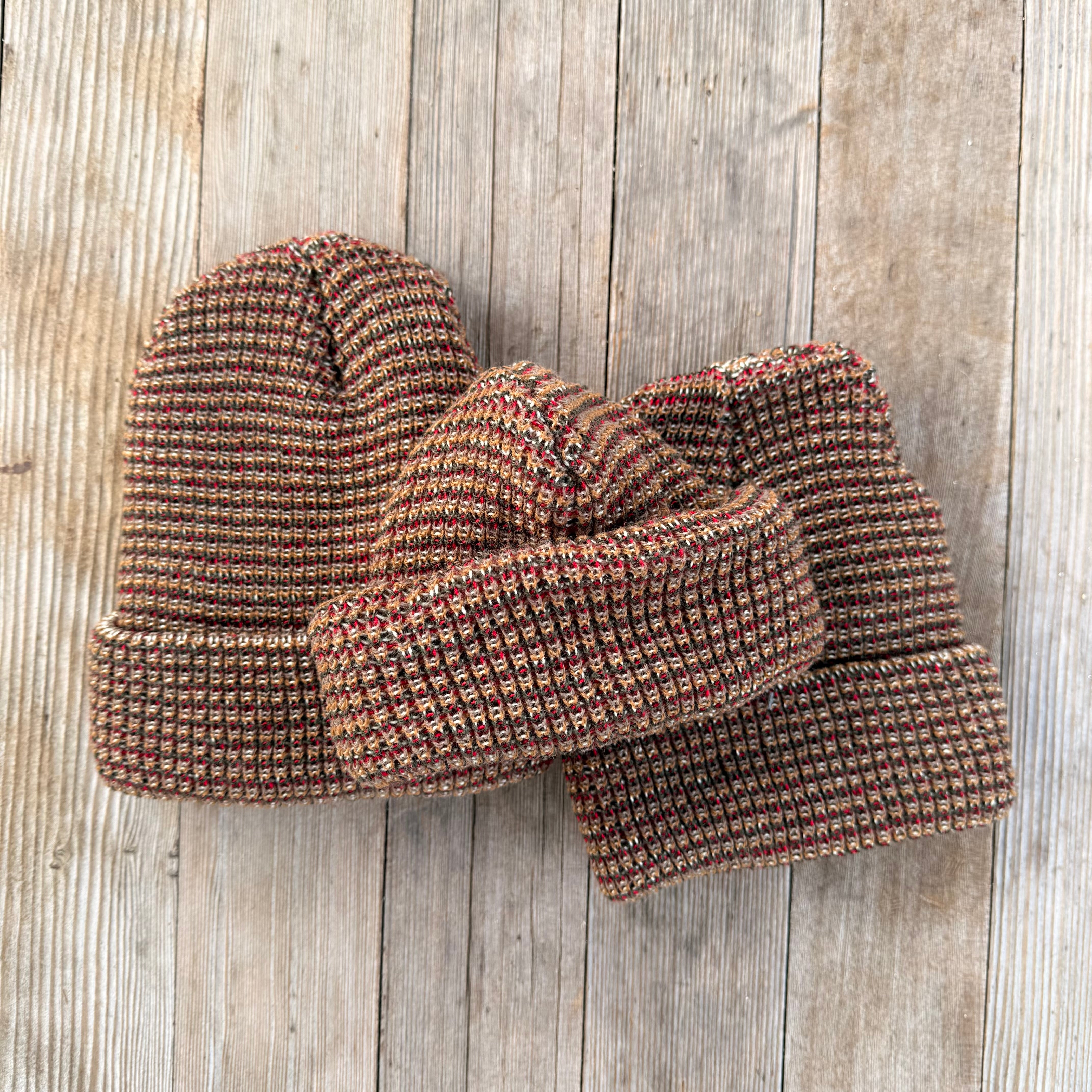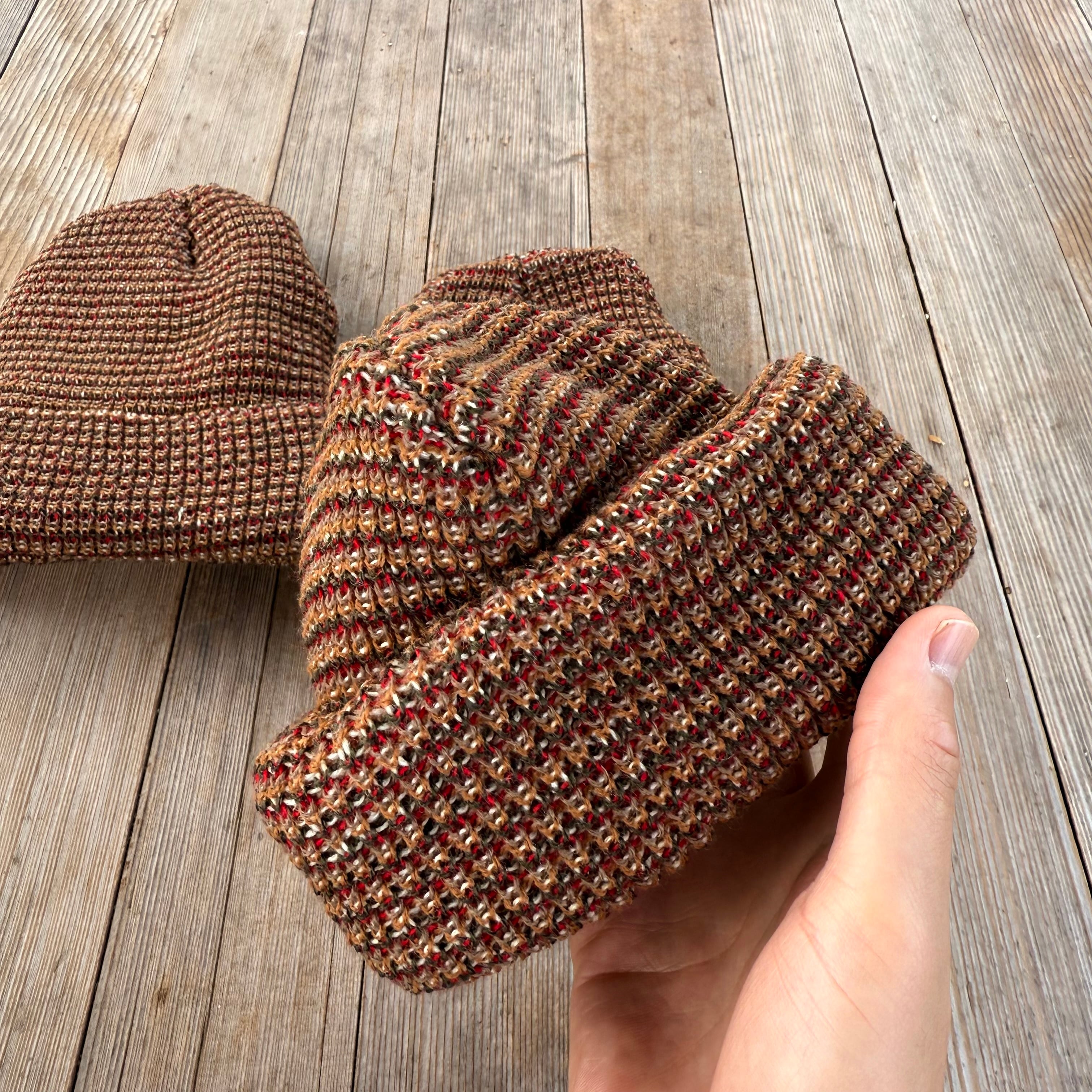 マルチカラーの編上げスタイルのビーニーです。使われている糸の色が多色で複雑で絶妙な雰囲気を醸し出しています。伸縮によって色味が変化するのも面白いです。