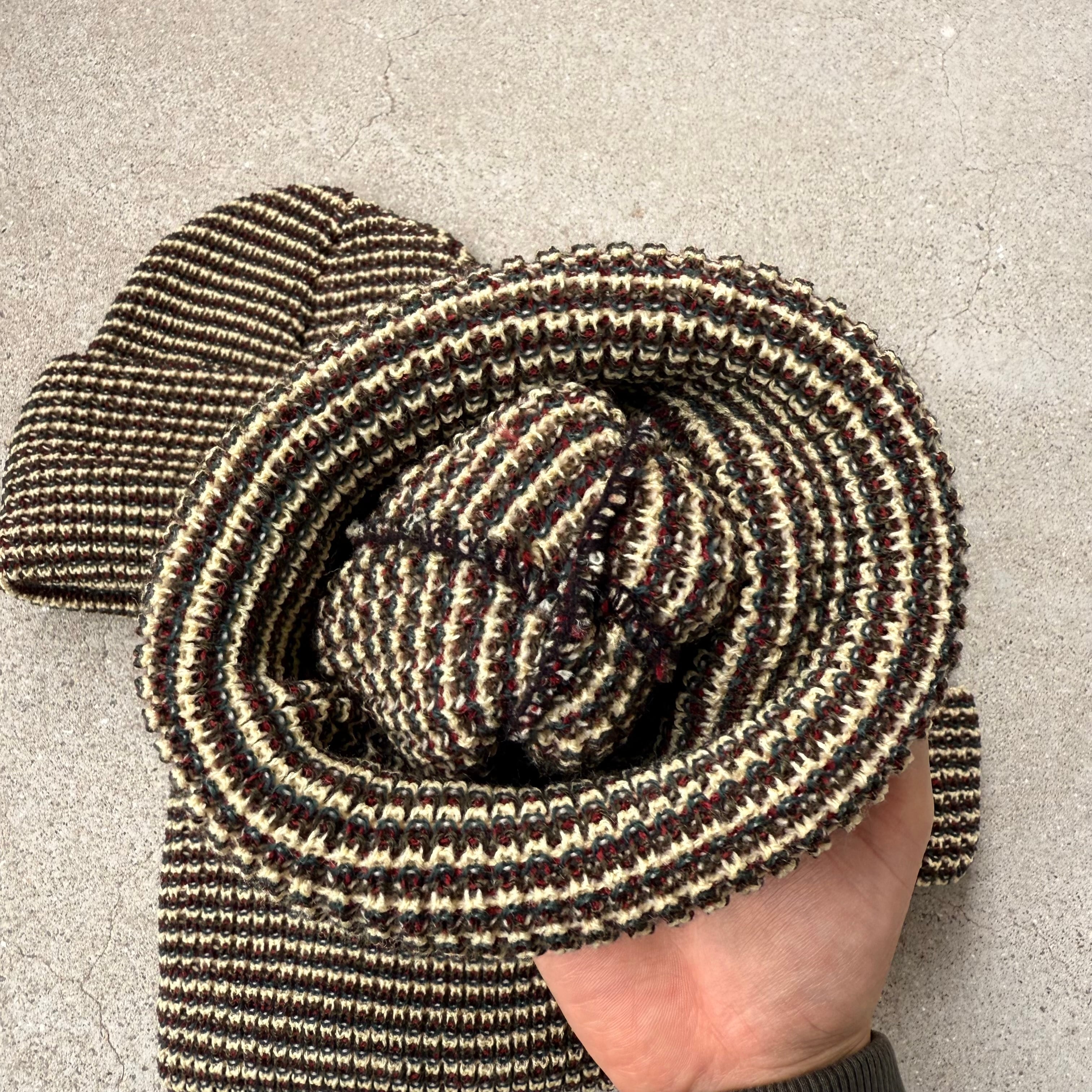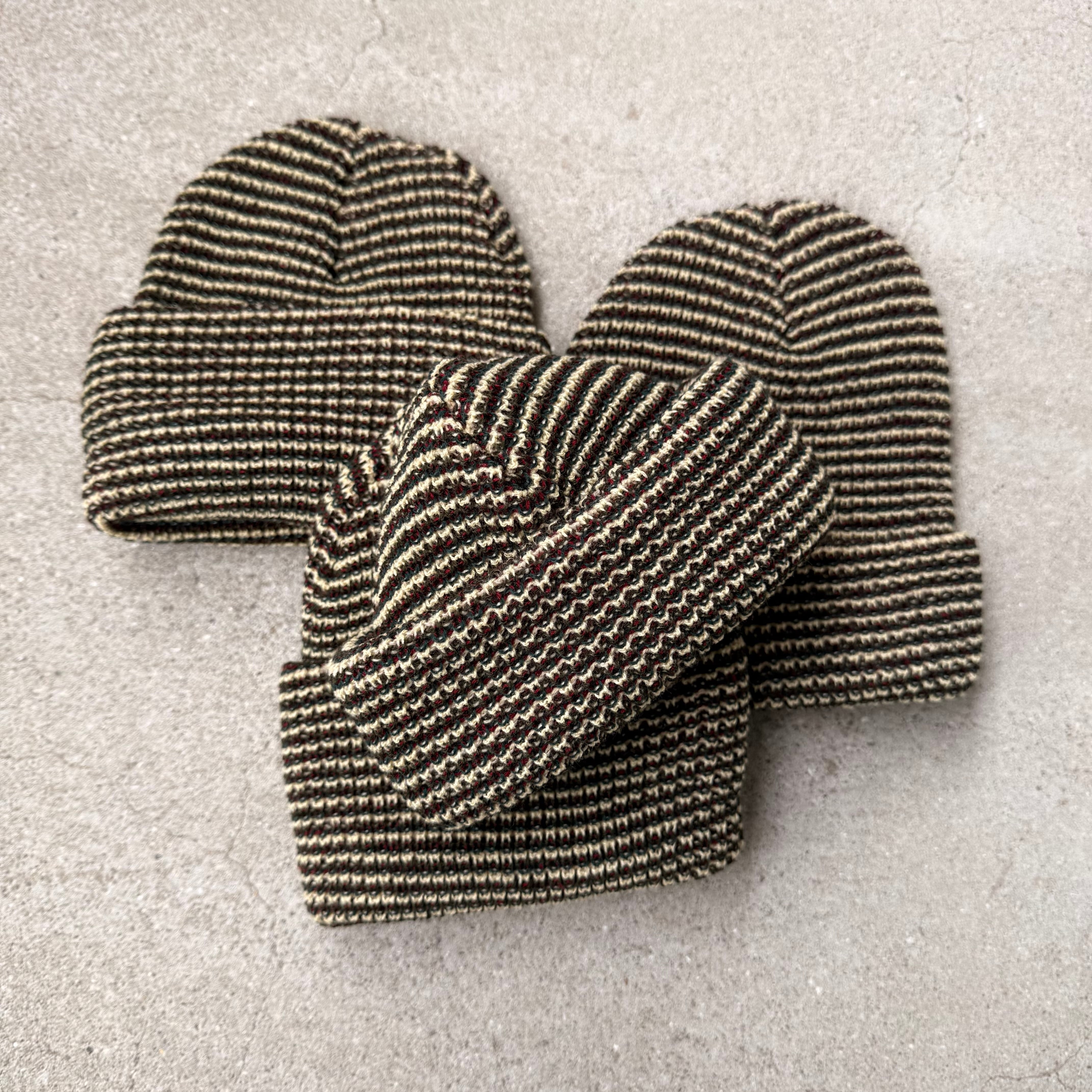 マルチカラーの編上げスタイルのビーニーです。使われている糸の色が多色で複雑で絶妙な雰囲気を醸し出しています。伸縮によって色味が変化するのも面白いです。