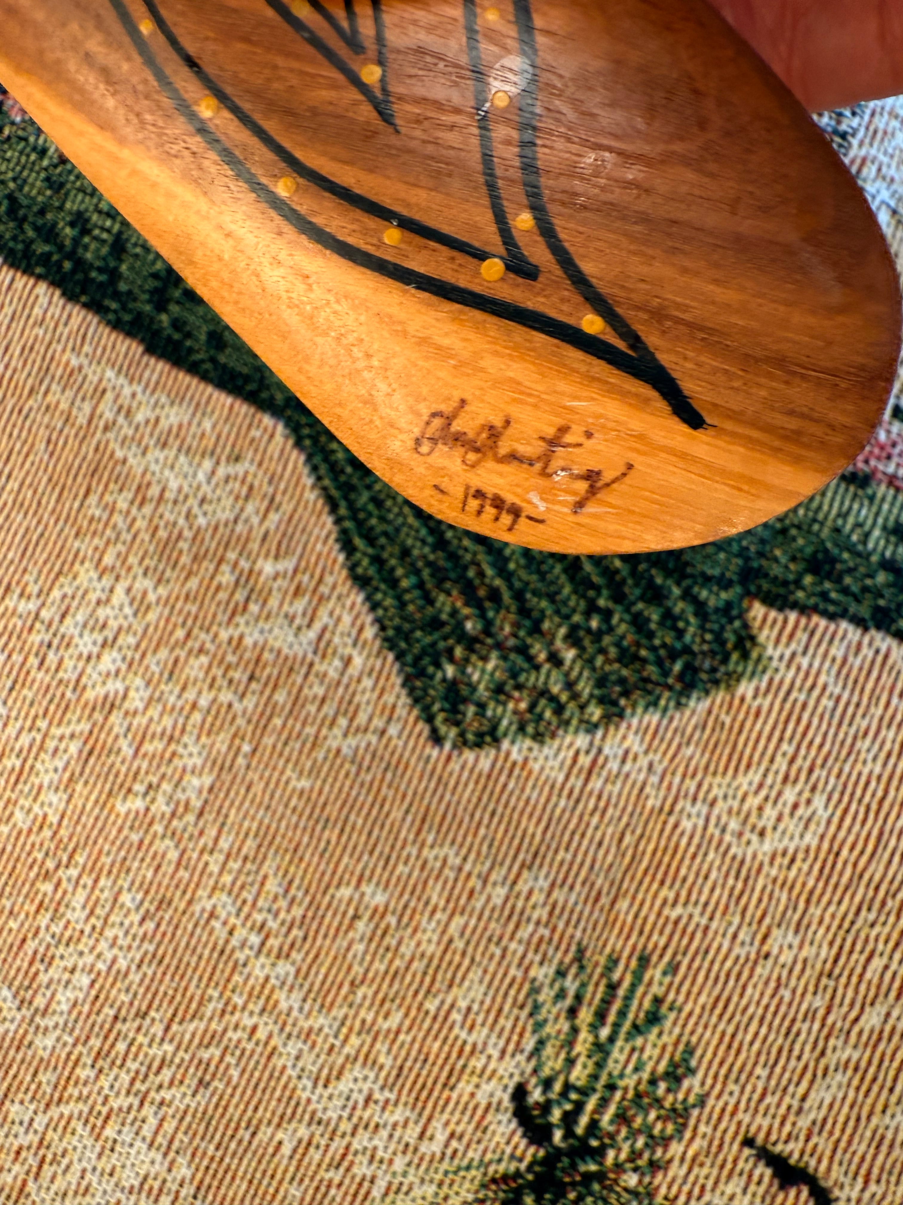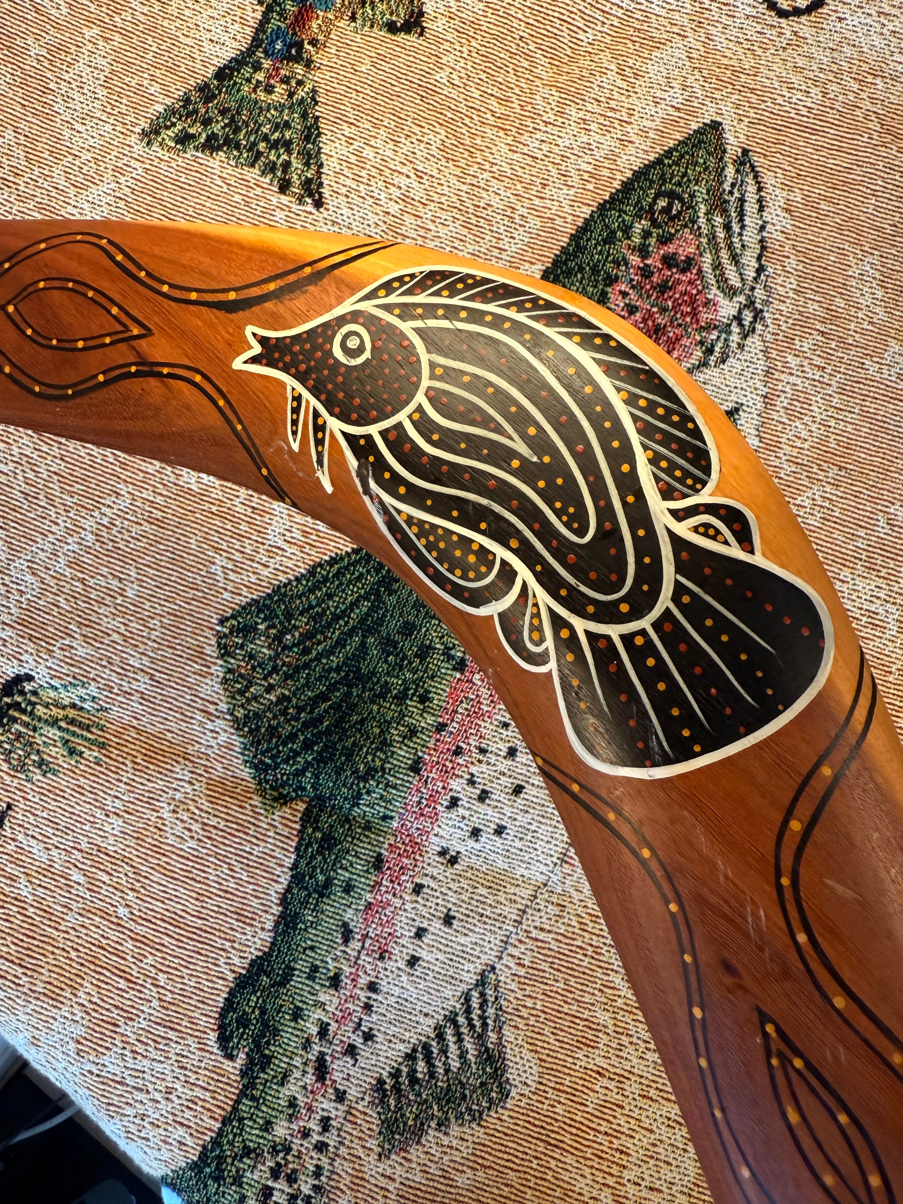 アメリカで見つけたオーストラリアのお土産のブーメランです。観賞用で先住民族であるアボリジニのドットペインティングスタイルで魚や独特の流線デザインが施されています。