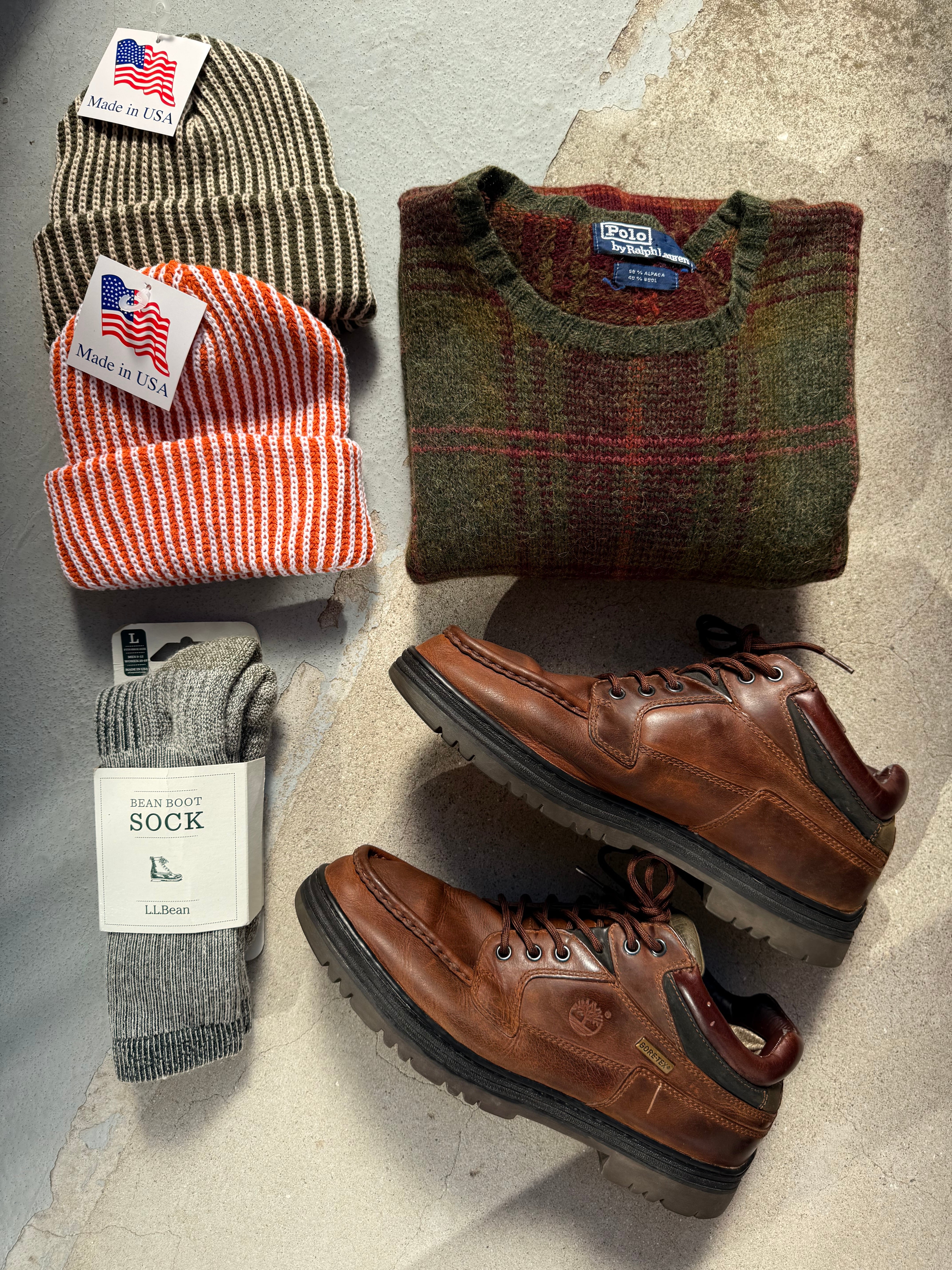 厚手で編みが緩めで大きめのシルエット。アメリカの田舎で木こりが被ってそうなラギッドな一枚です。