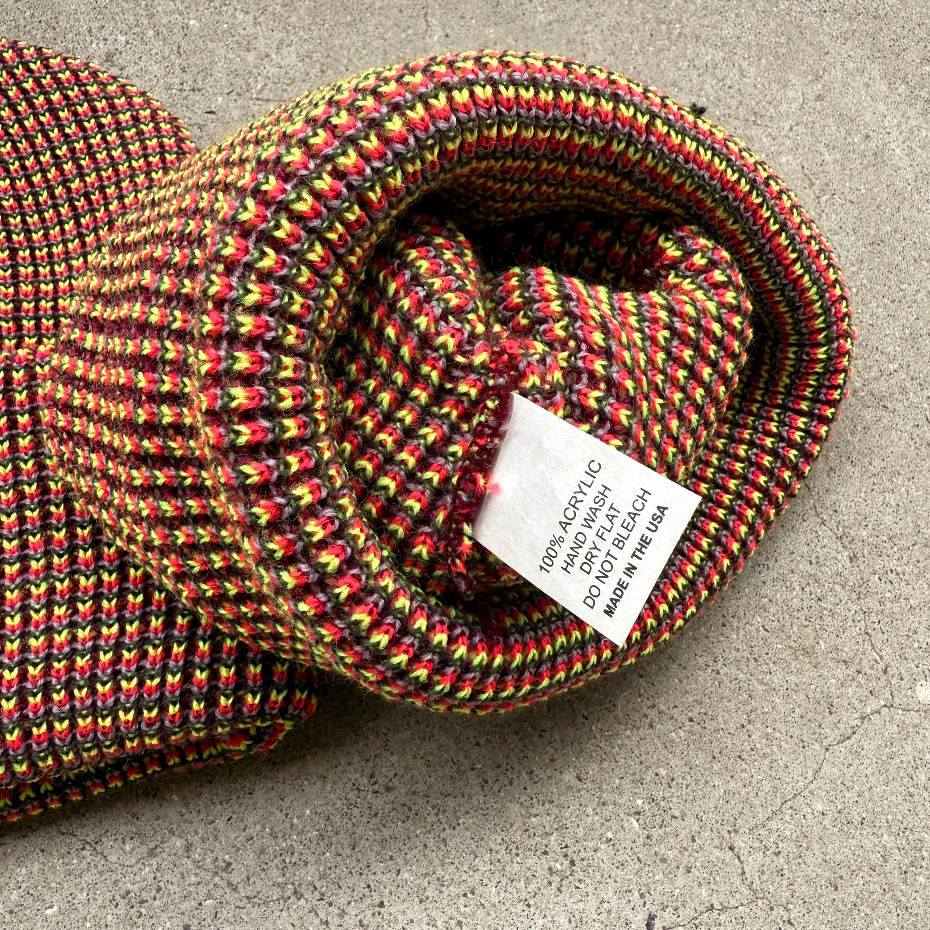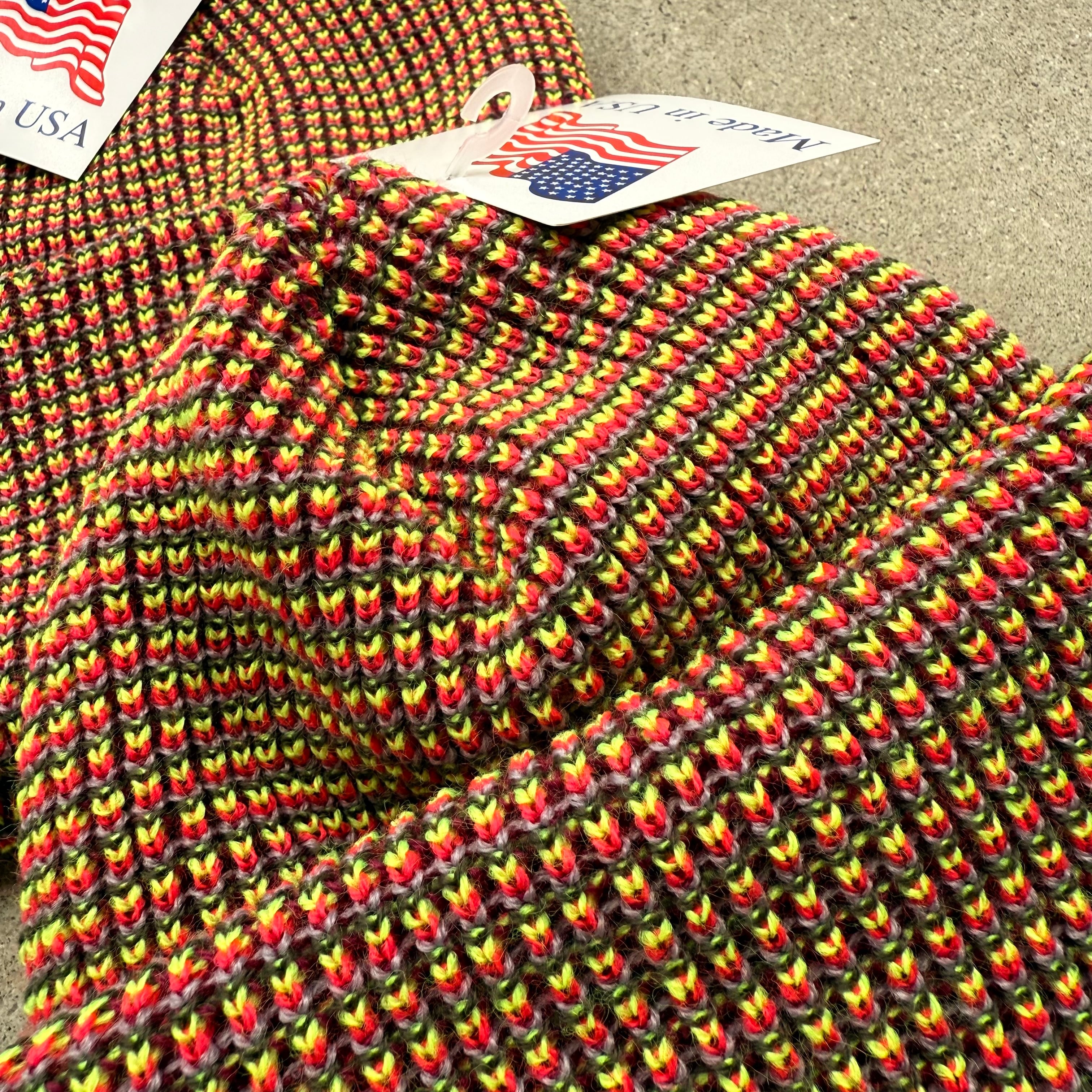 モザイク状のワッフル生地がなんとも言えない表情のアクリルビーニーです。単色のビーニーもいいけど、こういう感じのビーニーだとスタイルの表情が増すんですよね。