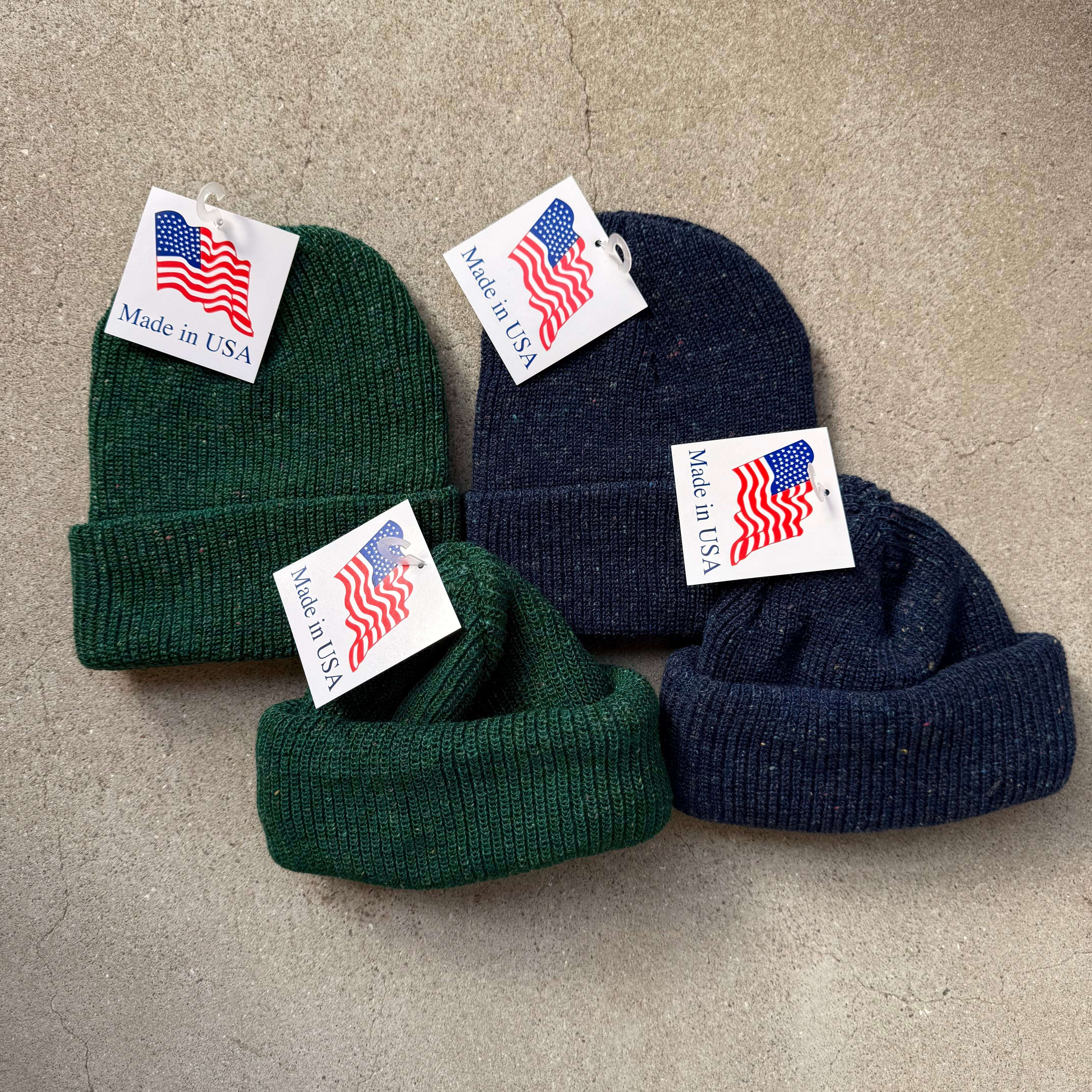 ボディはアップルグリーンとネイビーのご用意です。どちらも大変色味が良く、アートで少し都会的な印象のあるビーニーです。コットンブレンド特有の優しい肌触りもGood!