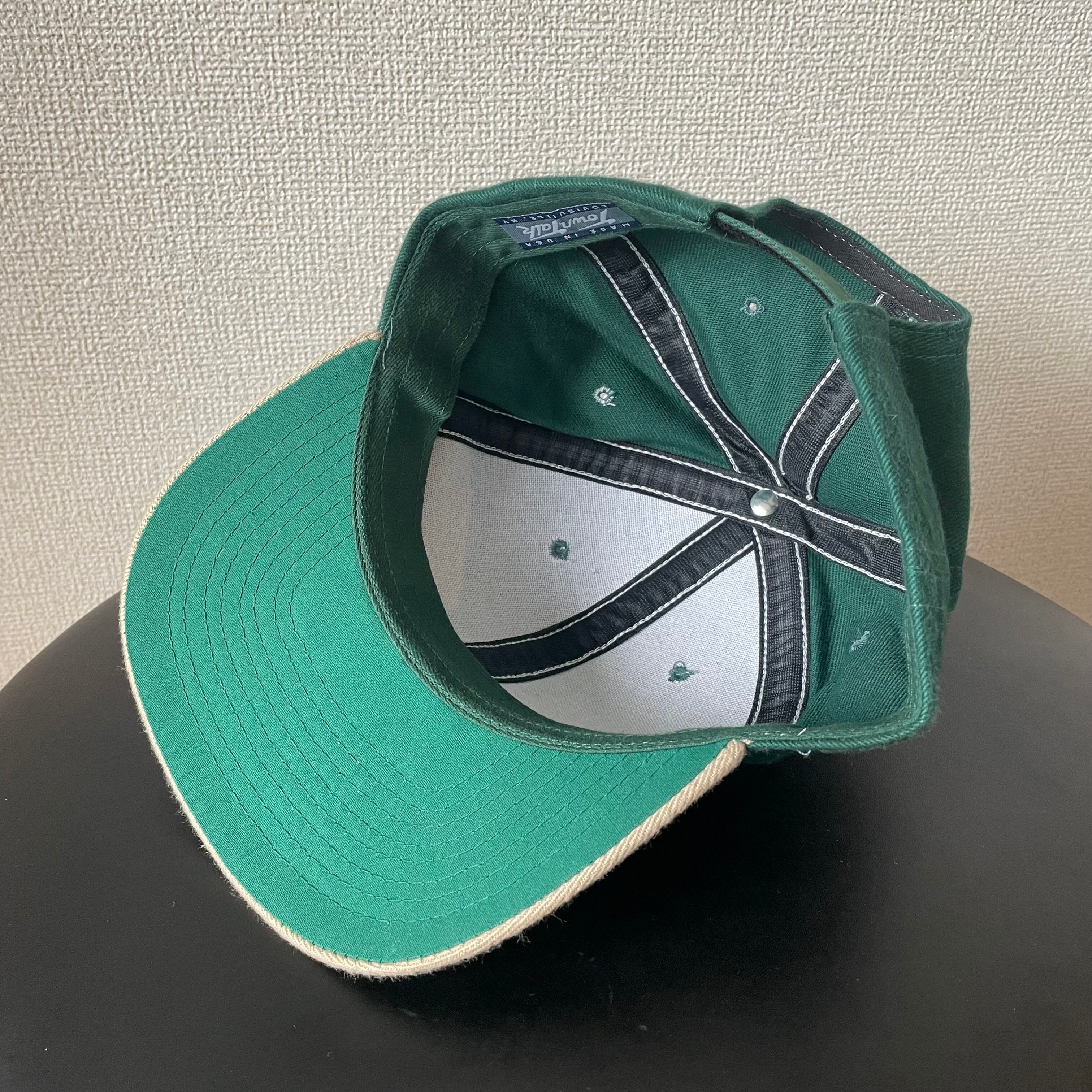 グリーンのクラウンに薄めのベージュのつばです。クラウンは硬めでニューエラのキャップのように雑に扱うと型崩れがおきるやつです。