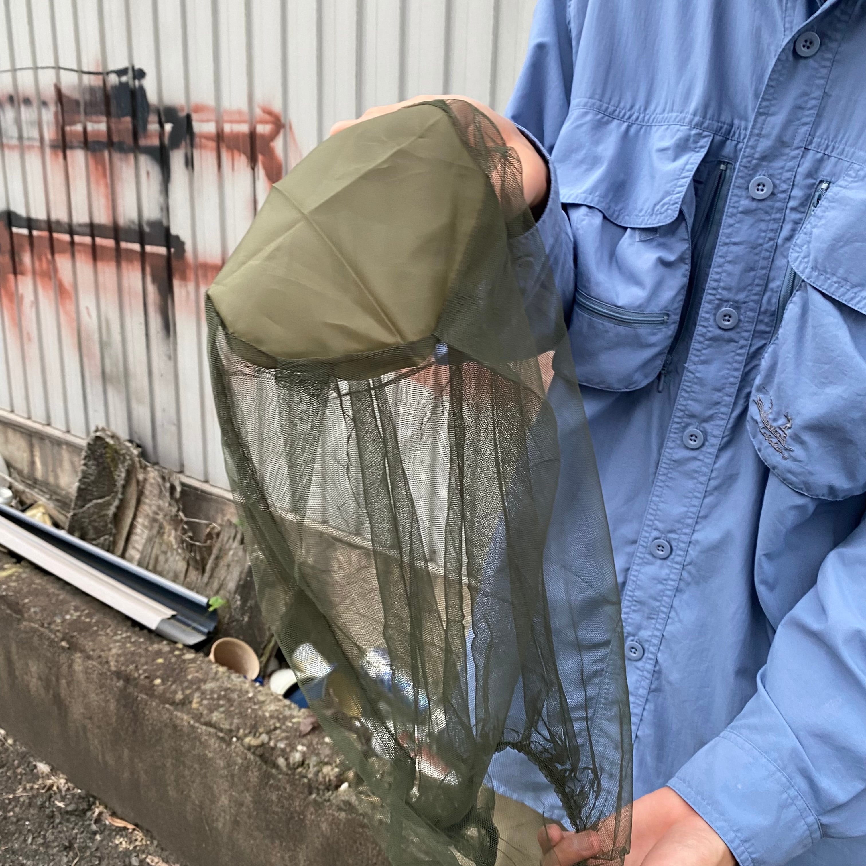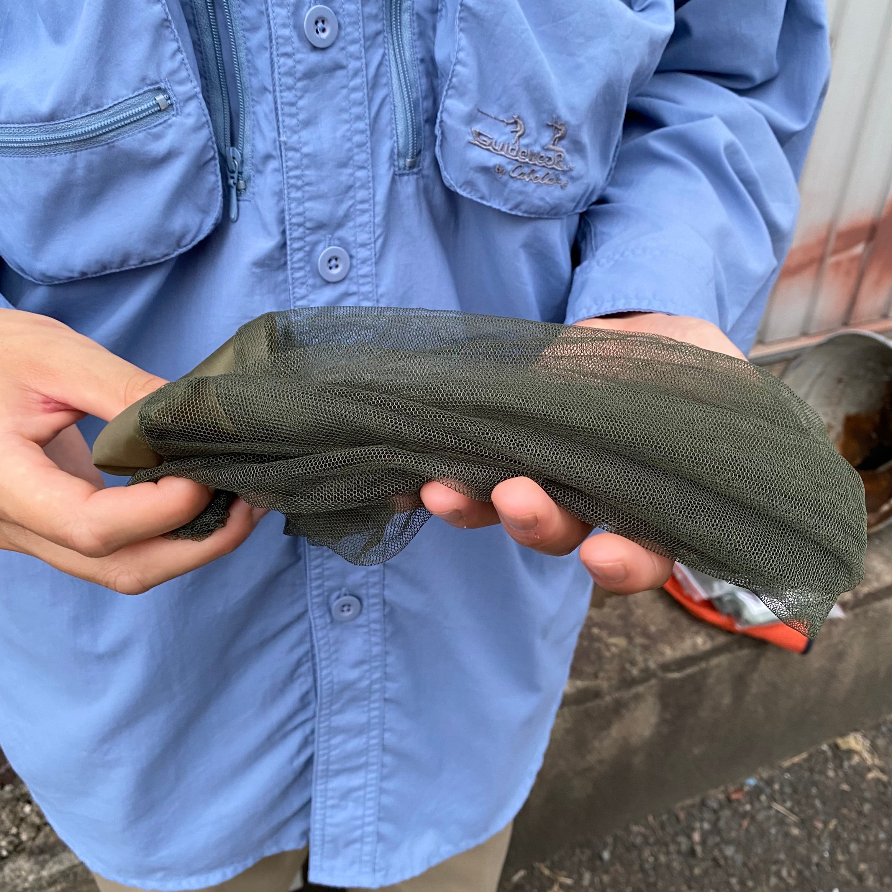 ハットの上から被る事を見越した作りで、トップには生地が切り替わってナイロンの素材が使われてます。ハットを覆うように肌とネットが距離を開けることで虫(バグ)から体を守ります。