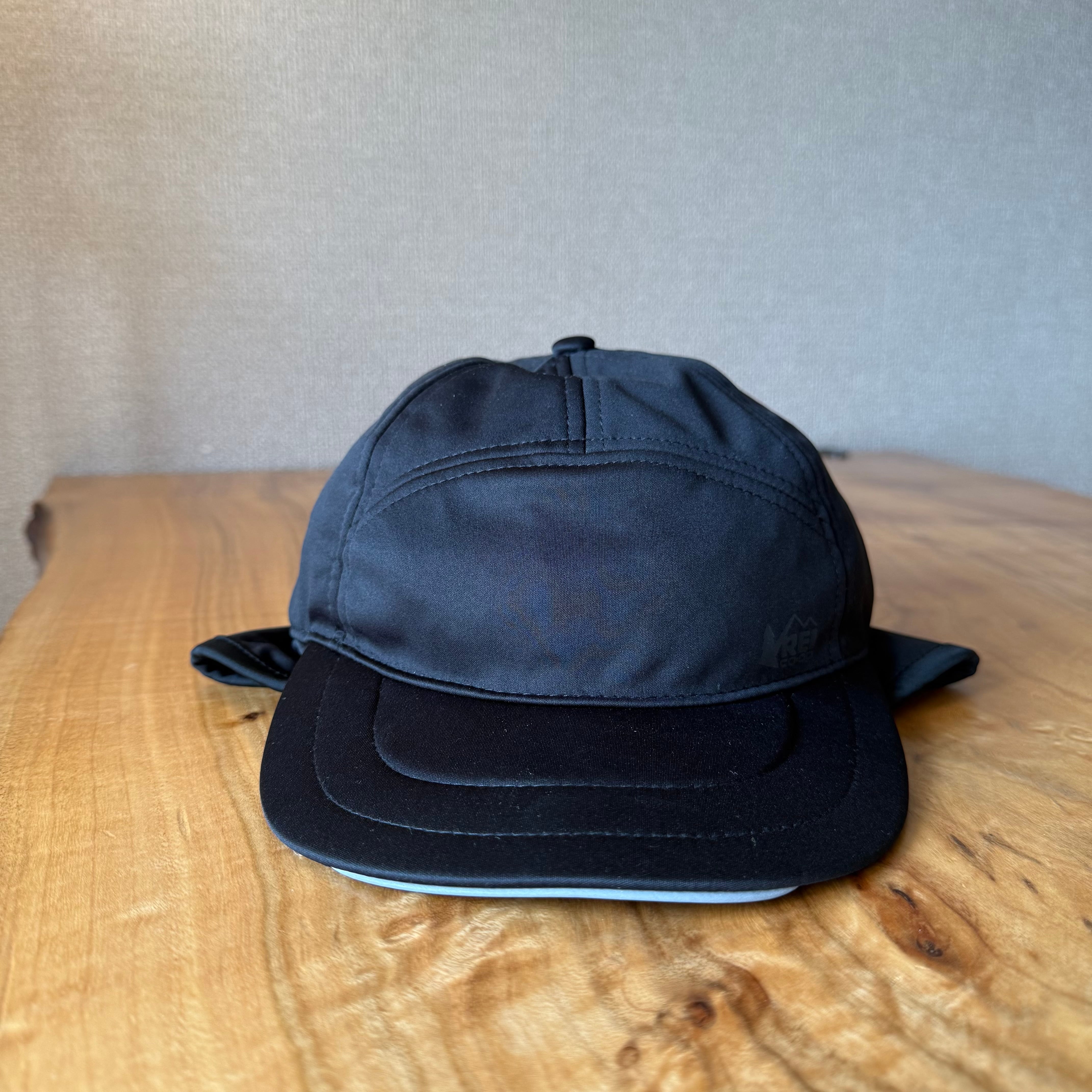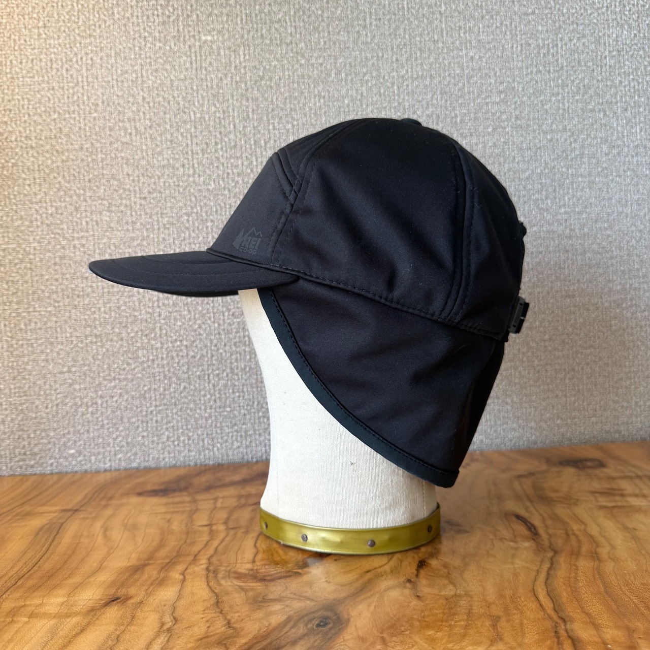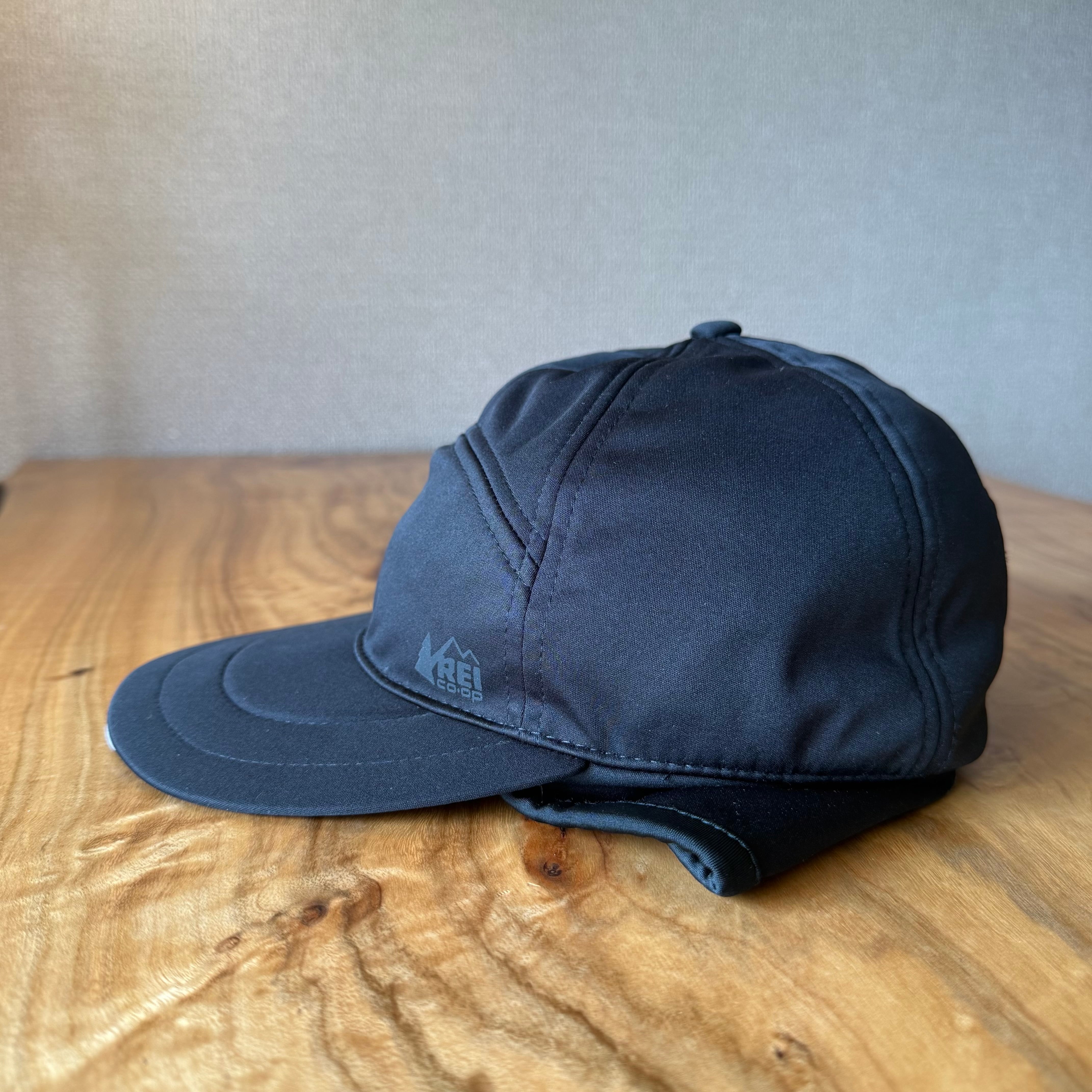 REIのフラップランニングキャップです。やや長めで柔らかいつばの先にはリフレクターがはめ込まれており、ナイトスポーツに最適です。フラップ部は風の侵入や抵抗を抑えらたまにピタッと耳に張り付く仕様です。プールキャップみたく見えるので、普段はフラップを上げておいて、状況によって下ろすのがカッコ良さそうです。