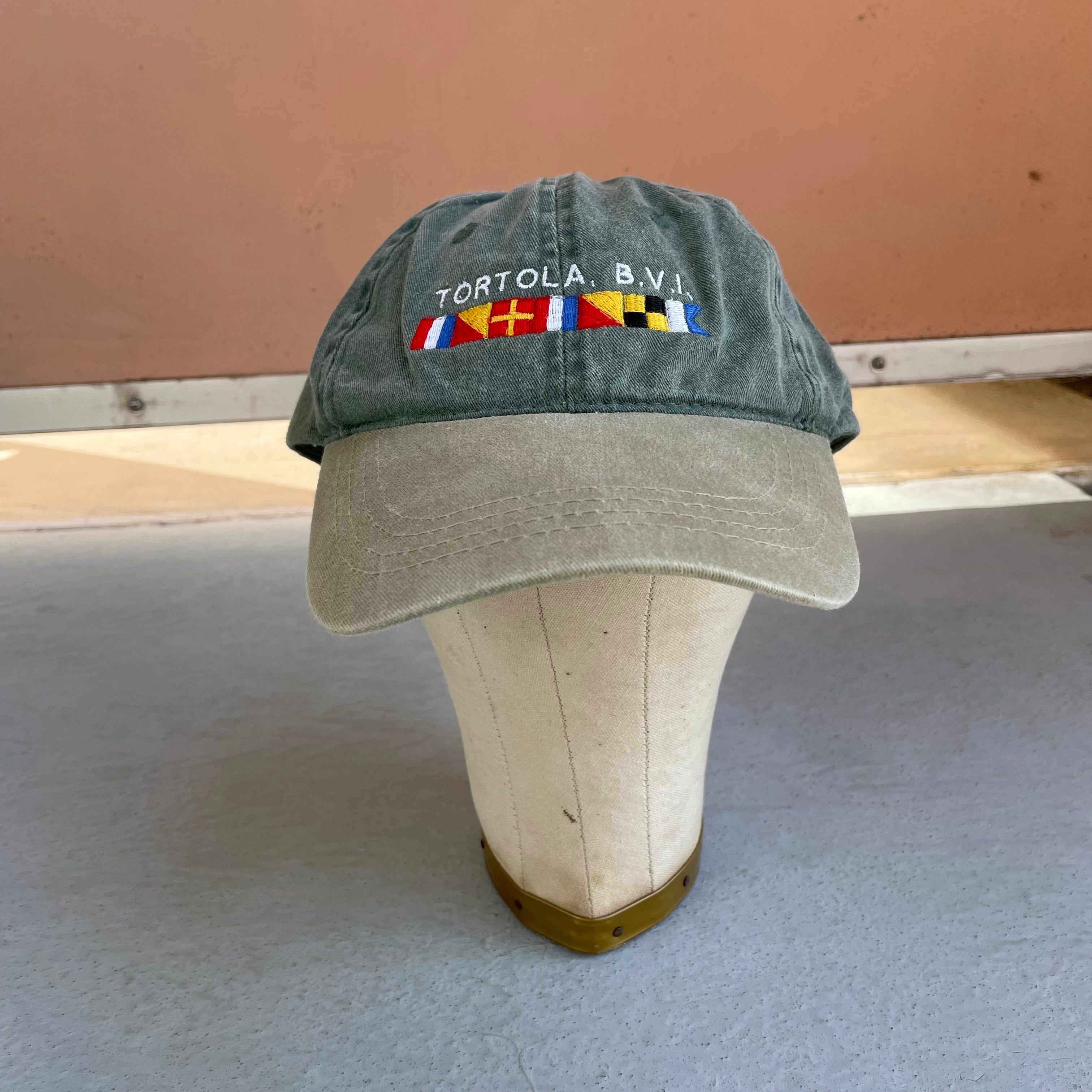 イギリス領にある島“TORTOLA”のお土産キャップです。ヨットや船の停泊地として人気があるようです。こちらのキャップもヨットの旗が入っています。