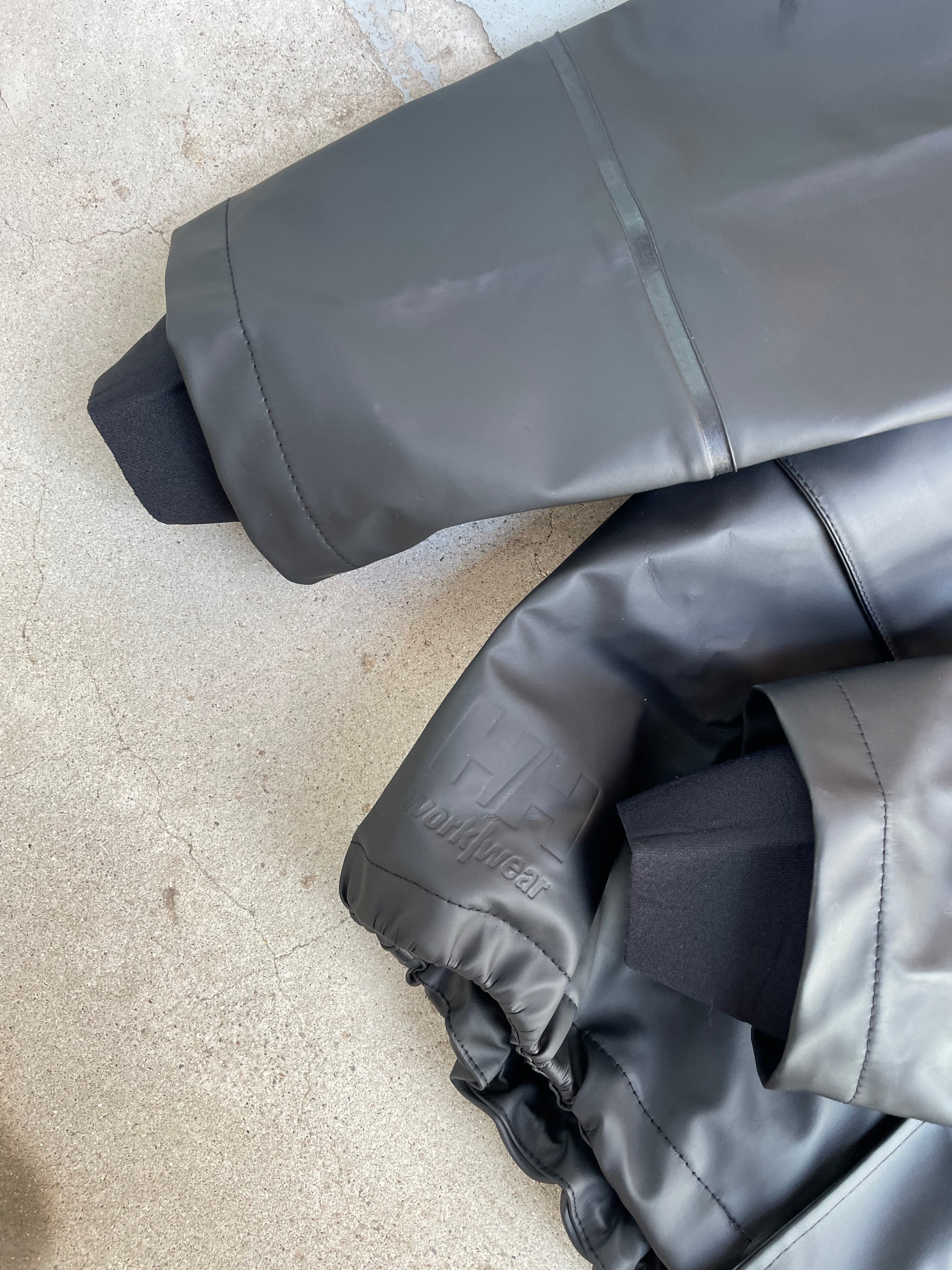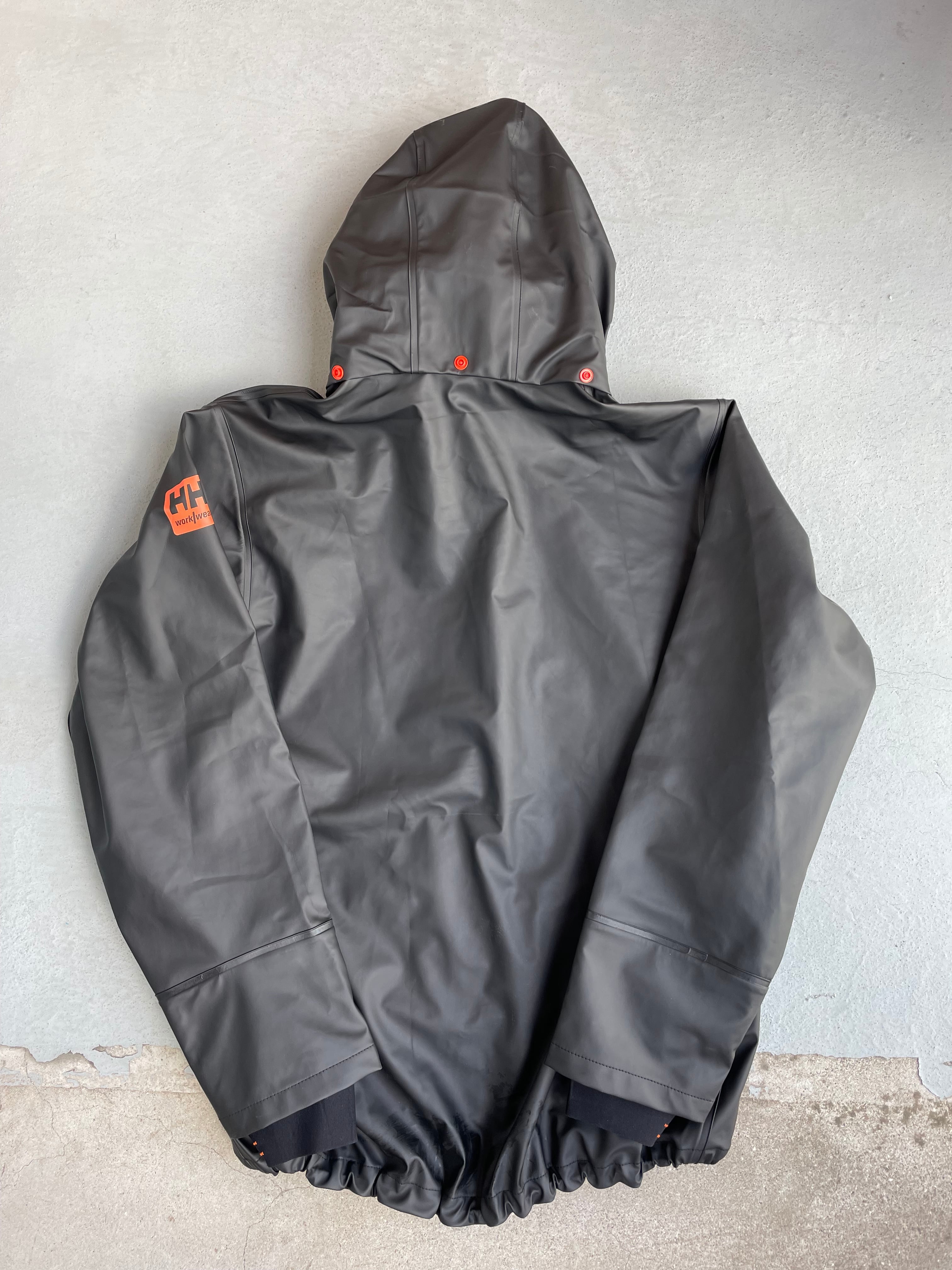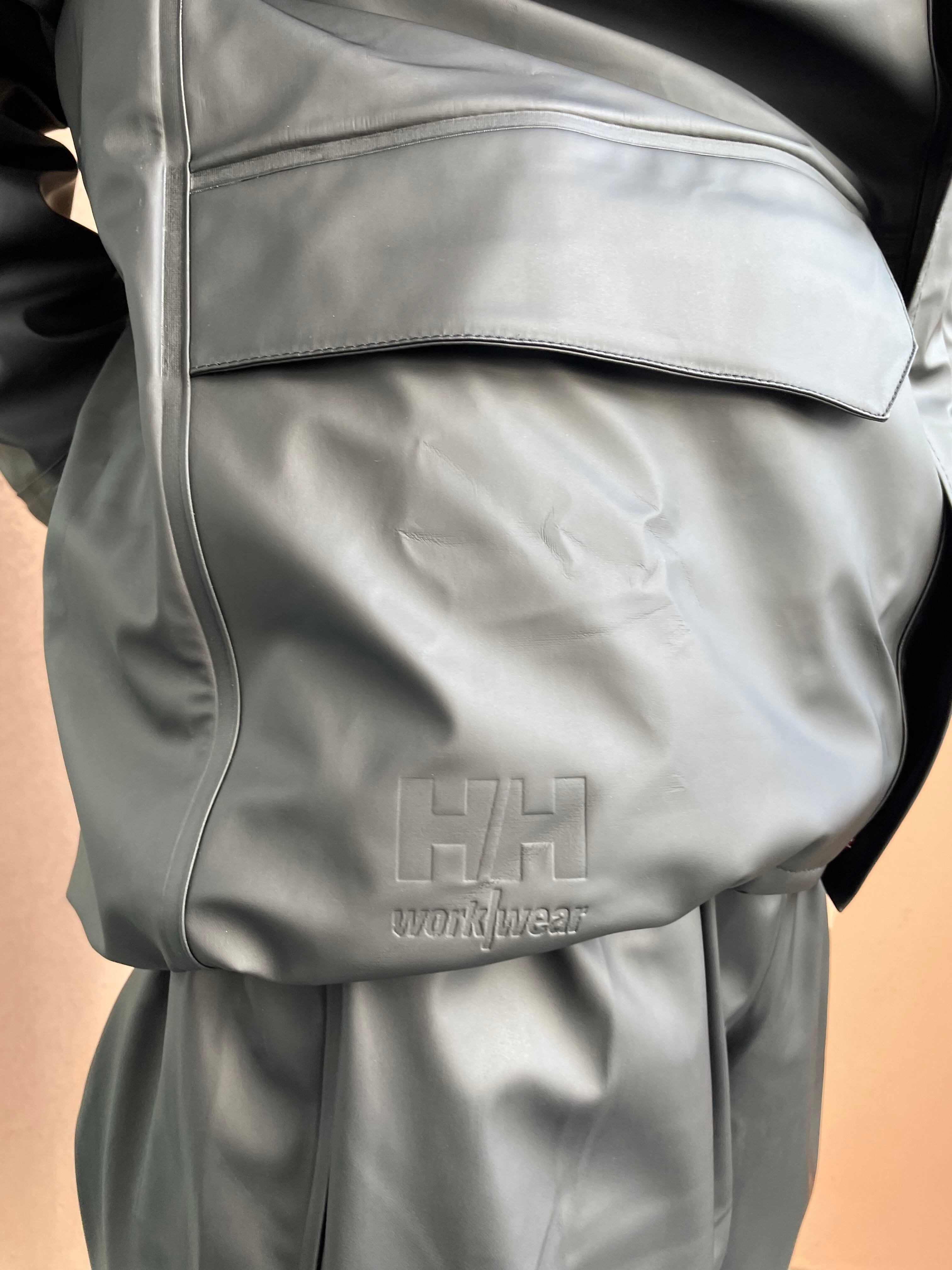 このジャケットはイメージで言うとガンガン使い倒せるけどカッコイイゴムガッパ。弱いところをあげるとすると、汚れがつきやすいこと。コンクリートやガードレールなどにもたれると色が移ってしまいます。しかし、ウェットティッシュなどで拭き取ると大体取れます。本来はヘリーハンセンが漁師さんや外仕事をする人用に作っているものなので、ガンガン汚す前提で道具として、作っているのだと思います。だから釣りなんかにはとても良いと思います。アメリカの漁師さんがよくきてるゴムガッパは血がついても落としやすいみたいです。(ゴアテックスとかだと、落ちにくい)