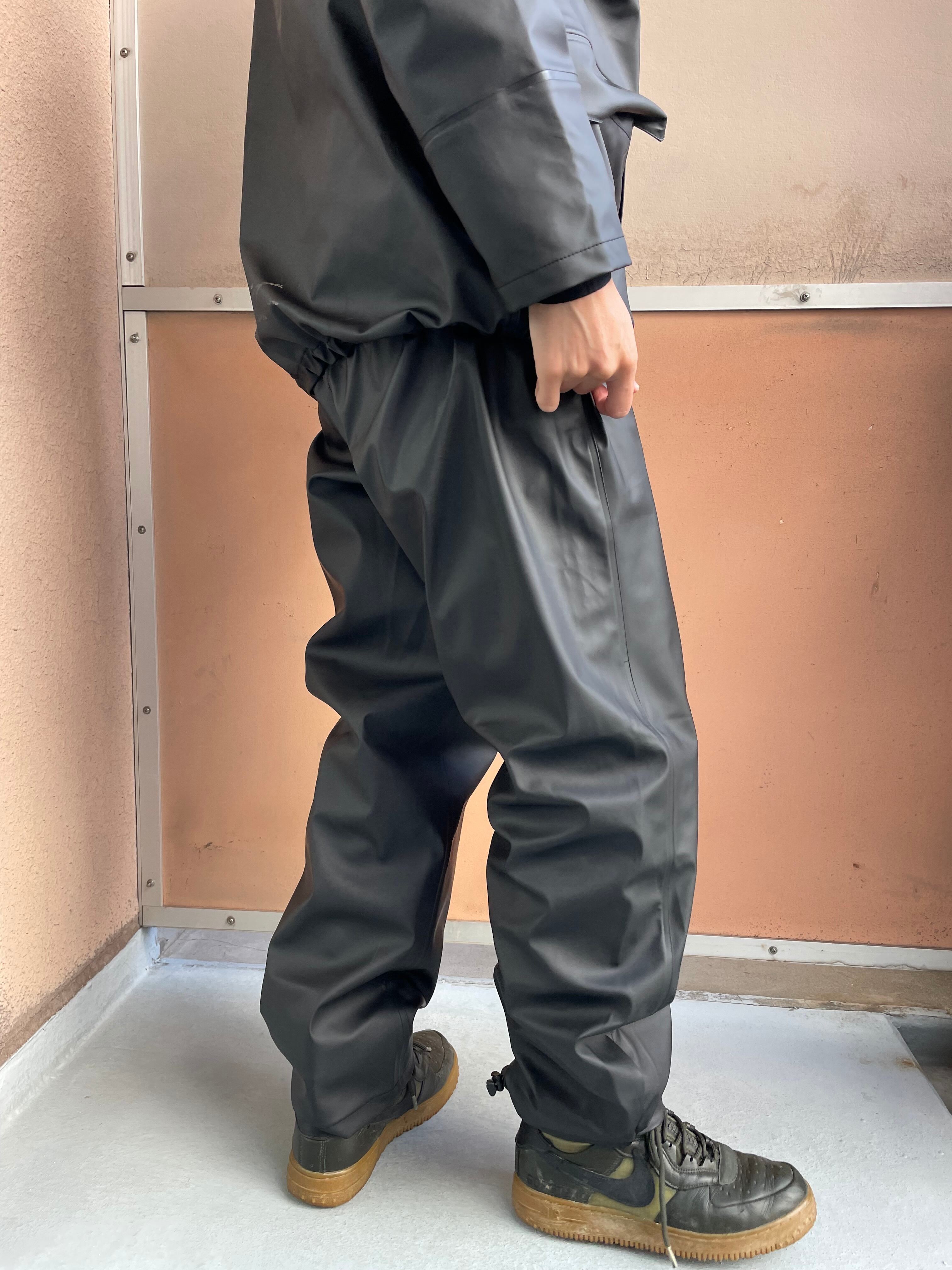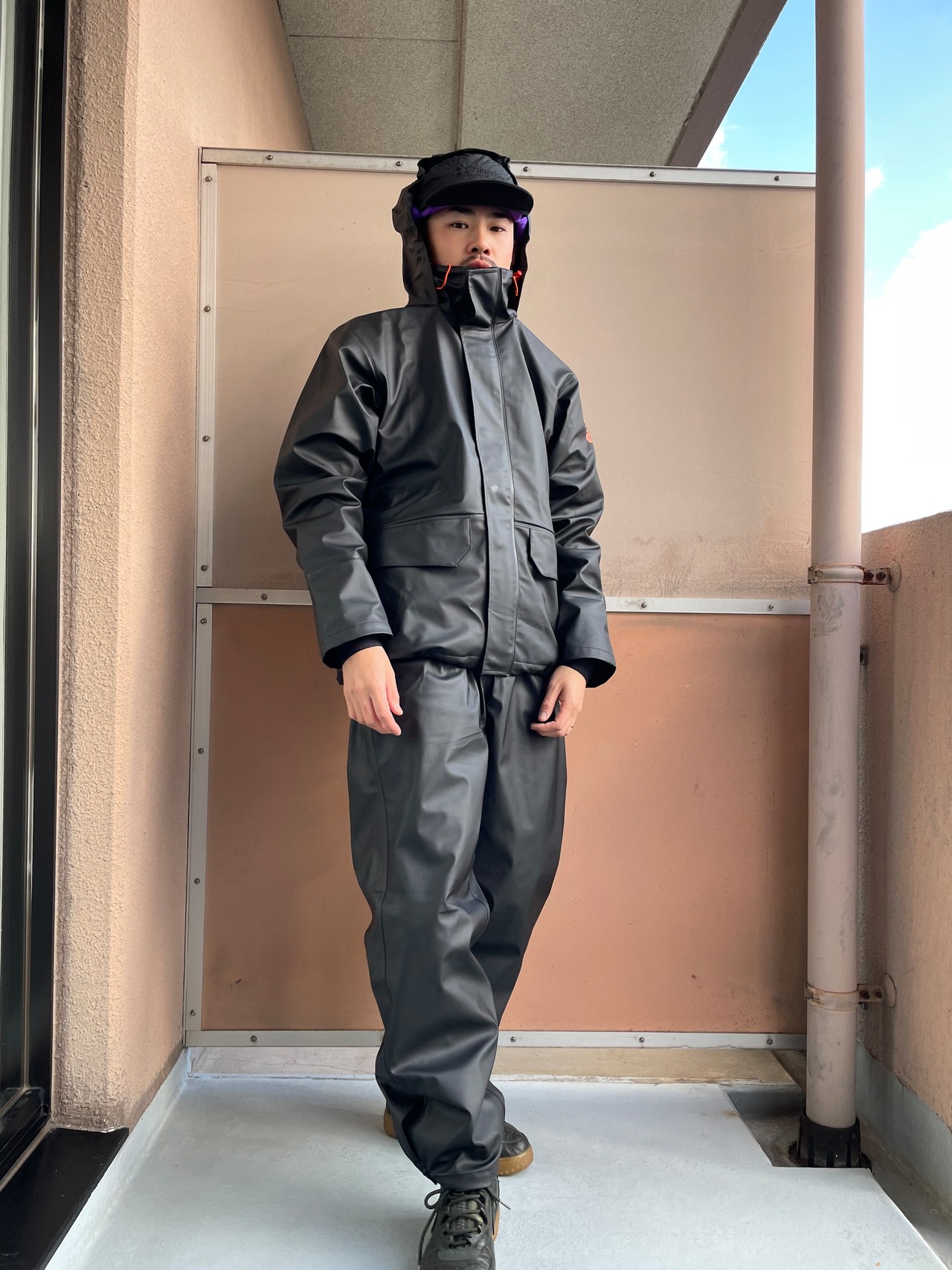風に雨に強いポリウレタンコーティングの生地は防風&防水で、耐久性がある特徴があります。さらにブラックで特異な艶かしい光沢感がポイントです。レインウェアにして、レザーのようなヘヴィなカッコ良さがあります。