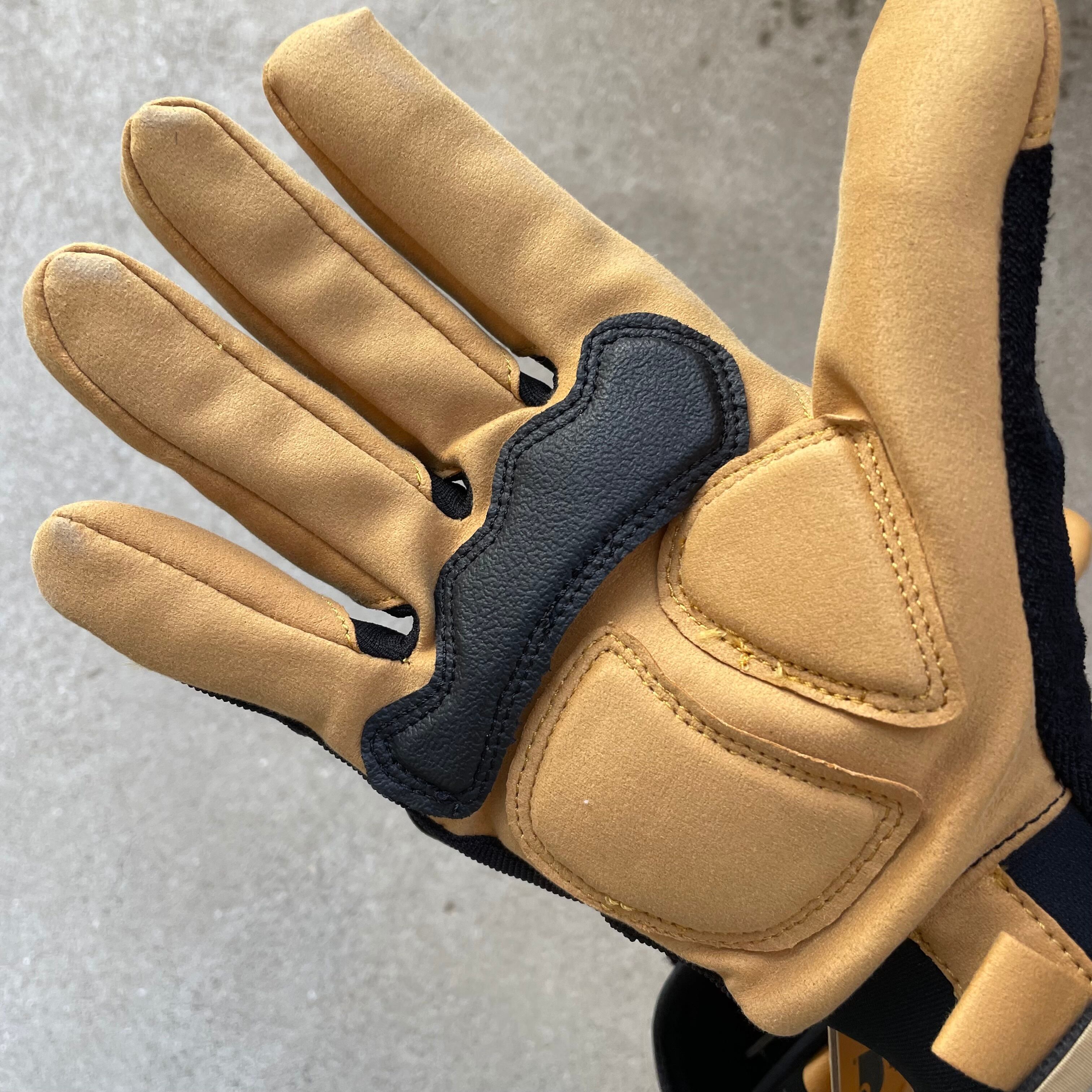 アメリカで買い付けたカーハートのグローブです。異素材が多様に組み込まれたアメリカのカーハートの中でも一際目立つグローブです。特に衝撃に対してよく吸収することを目的に作られたグローブのようで、手のひら、ナックル部、指にかけて保護パッドが縫い付けられています。