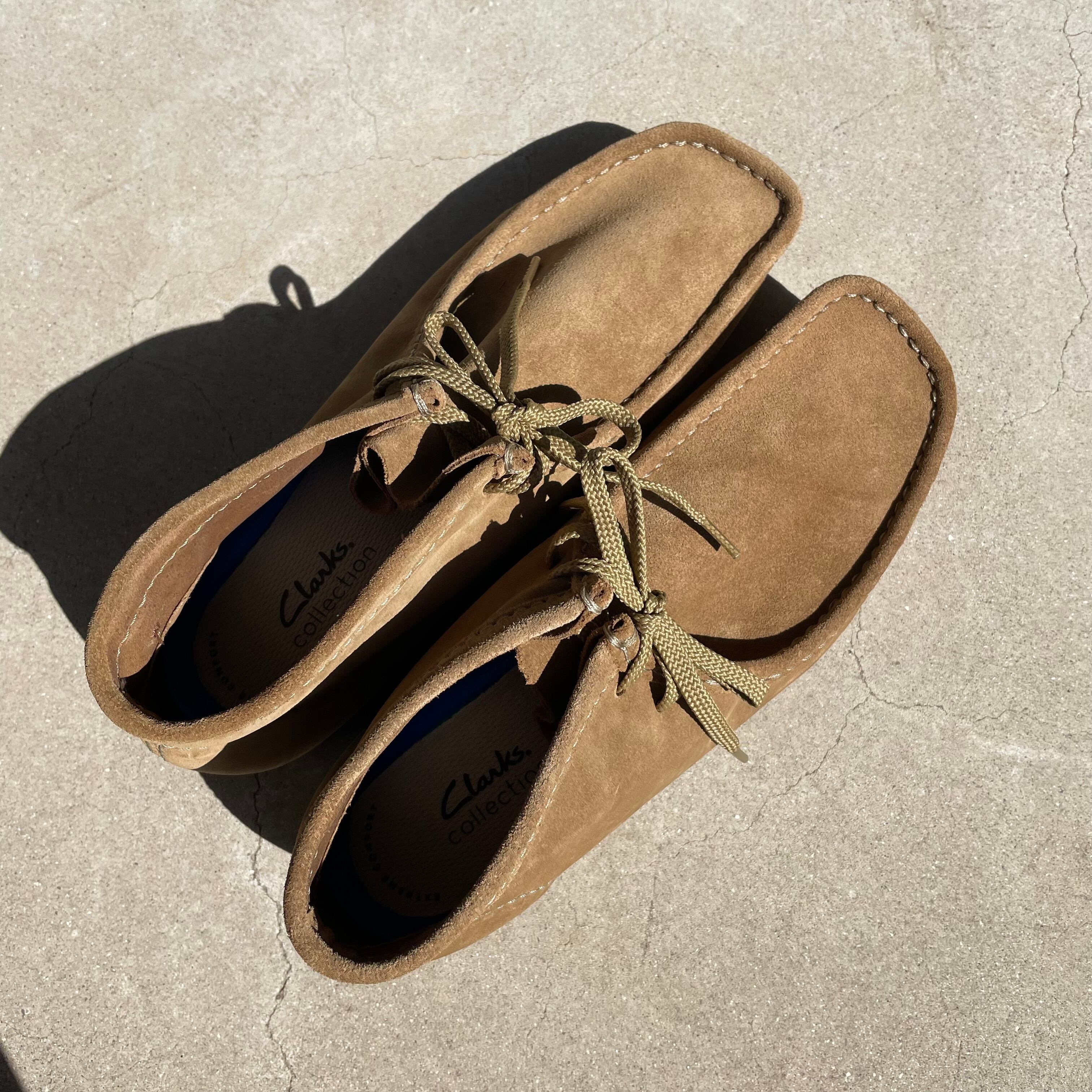 アメリカ買い付けのクラークスのワラビーです。ハイカットでキャメルのスエードボディの一足です。