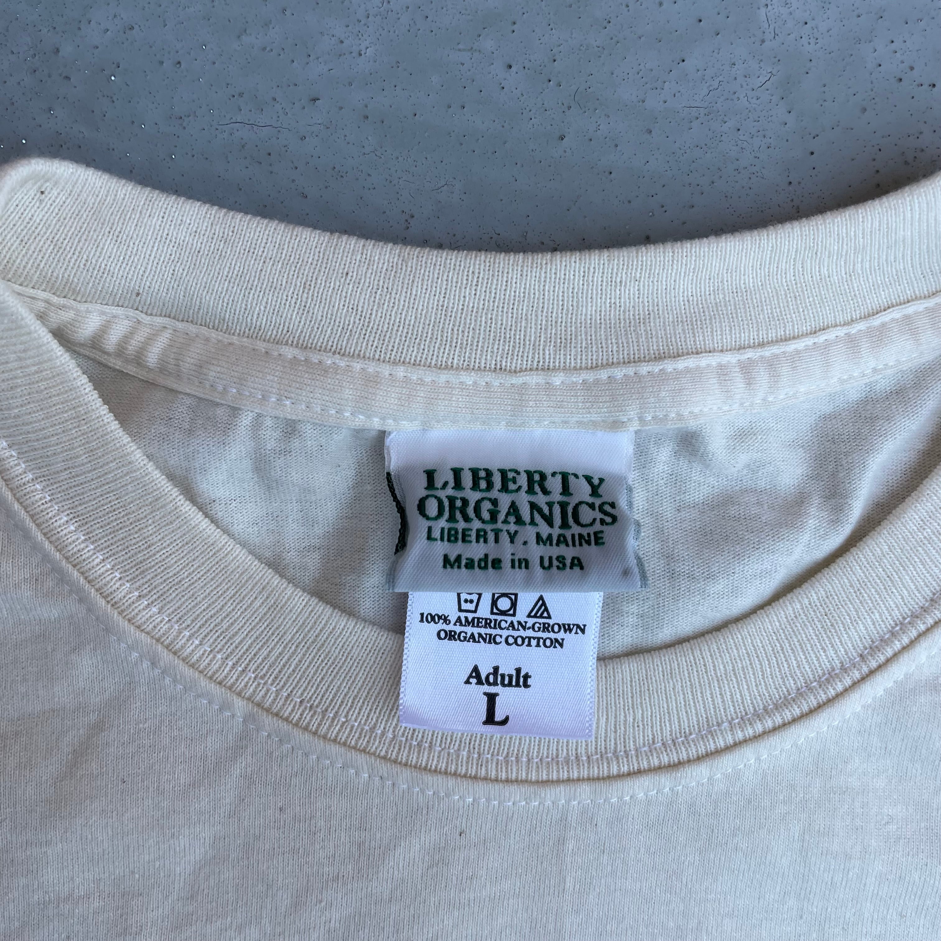 Liberty Graphics(旧Harborside Graphics)といえば、古いエルエルビーンのTシャツなんかでお馴染み、自然派のシルクスクリーンのプリントTシャツ屋さん。こちらは現行品の中でもGILDANボディではなく、USA製オーガニックコットンの自社ボディが使われた1番イイやつで、肌触りが最高です。