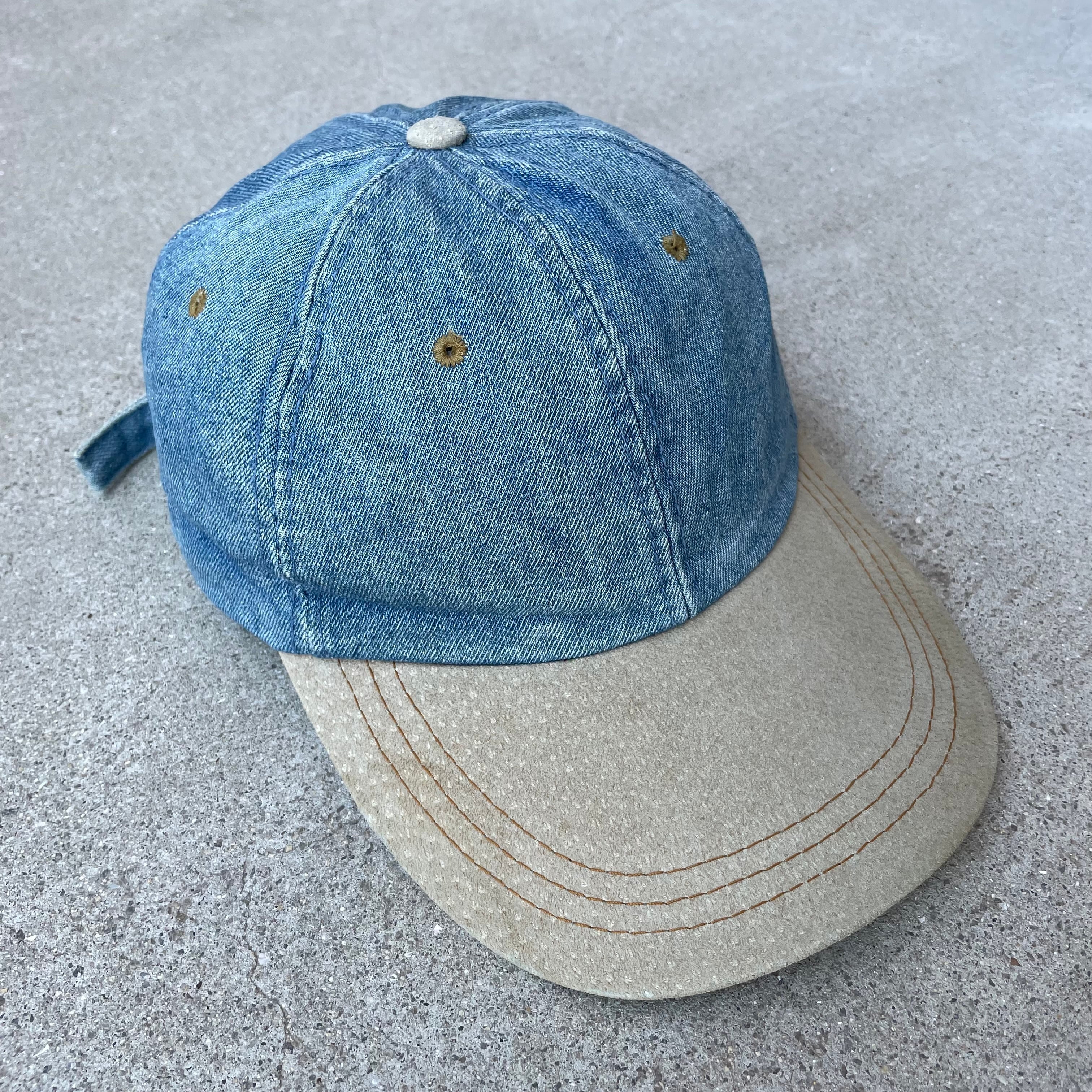 無地のツートンキャップです。クラウンがデニム、ブリムがスエードでできています。