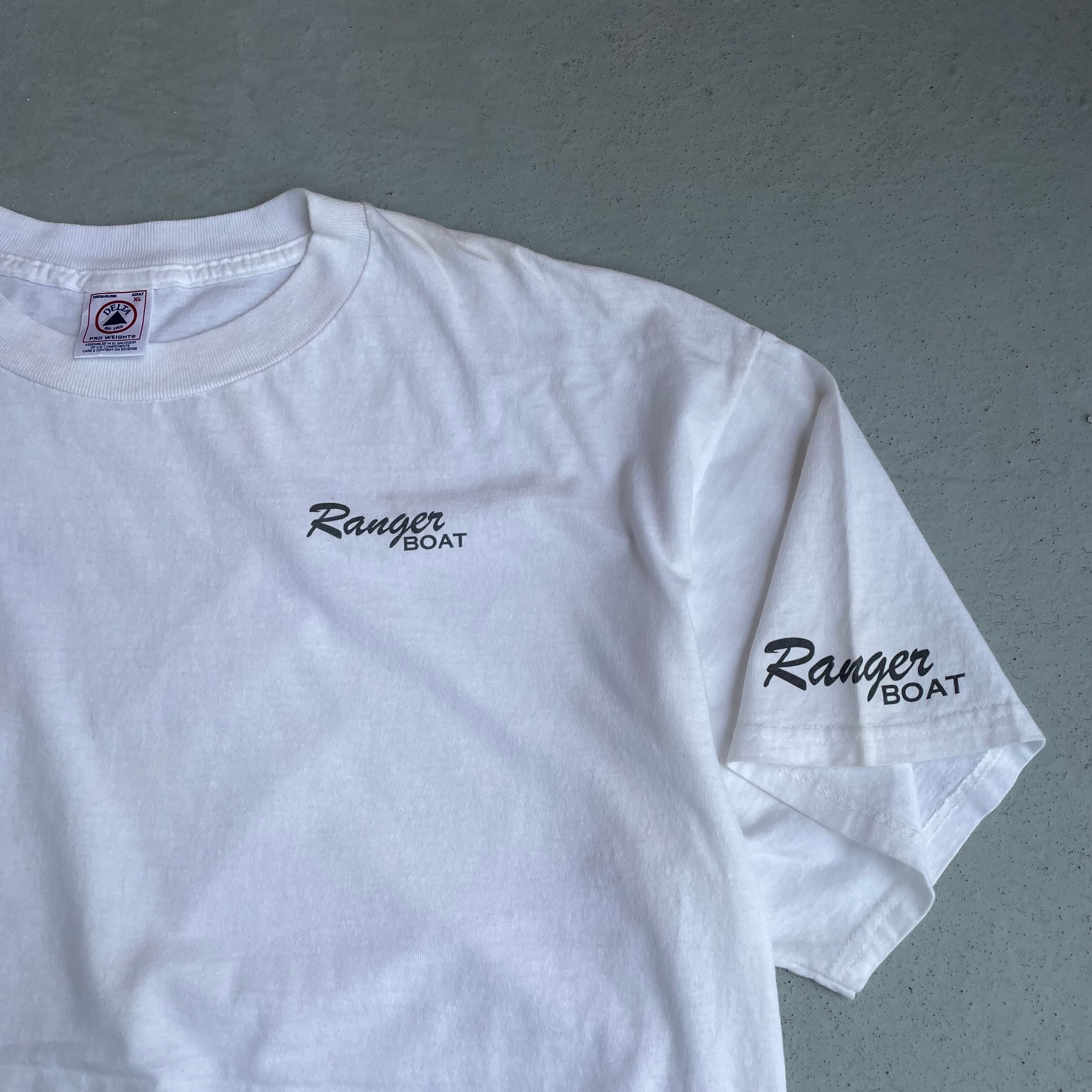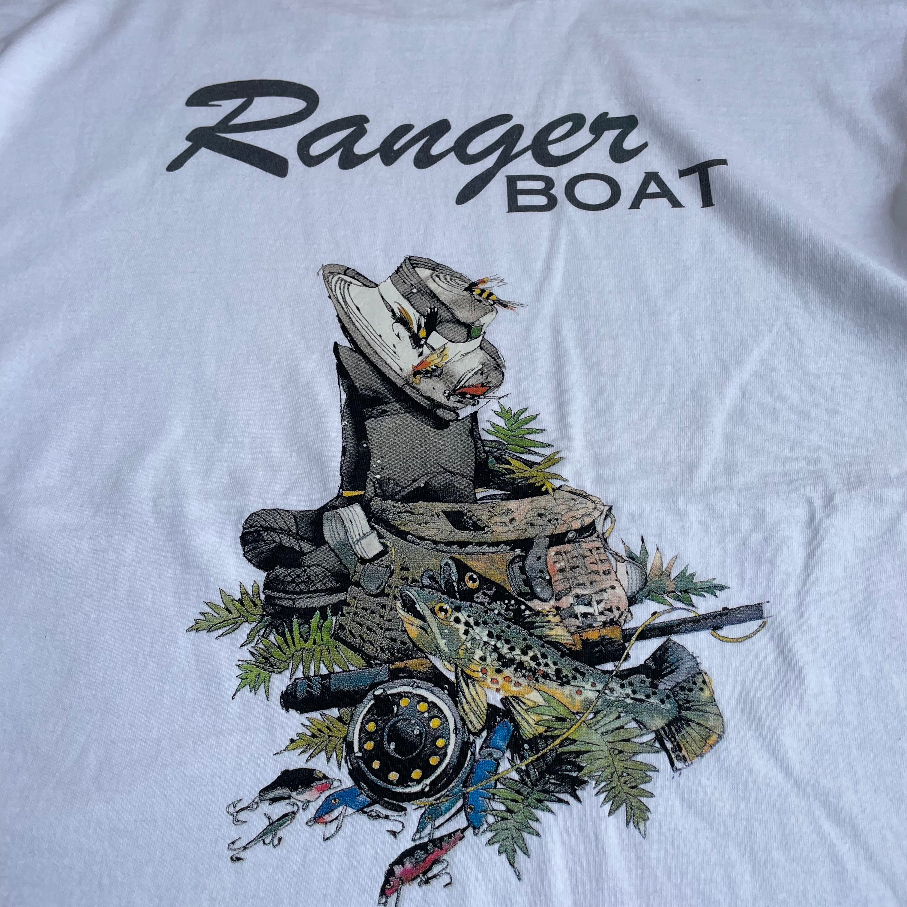 アメリカの老舗バスフィッシングボートメーカー“Ranger Boat”の90年代頃のTシャツです。ミノーやアイスジグとともにブラウントラウトが描かれています。