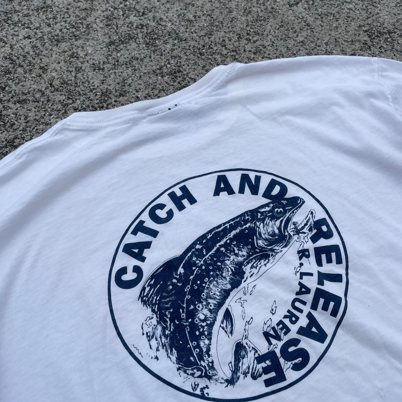 ヴィンテージポロの中のフィッシングラインの“CATCH&RELEASE”のトラウトTシャツです。バックのトラウトデザインはもちろん、ポケットの上に入るパドルとポロスポーツ の文字もカッコいいです。タグはブルーレーベルなので過渡期の一枚だと思います。